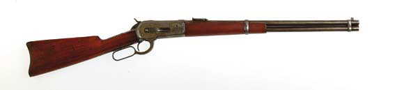 WINCHESTER MODEL 1886 SADDLE RING CARBINE. Cal. 40-65. Standard grade carbine with 22″ bbl, full magazine, uncheckered wood, straight stock with smooth steel, carbine buttplate and a saddle ring on left side of receiver with short ladder sight on bbl. Accompanied by a Winchester Museum letter identifying this carbine as having been shipped June 15, 1898. SN 115280. CONDITION: Good. No original finish remains on the bbl and magazine tube. Receiver has traces of case colors in the sheltered areas with scattered silvered case colors. Forearm has a crack at the end and the wood has been sanded with a light finish. Worn shiny bore. 4-46667 JR20 (2,500-3,500)