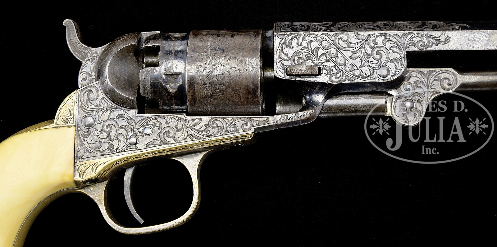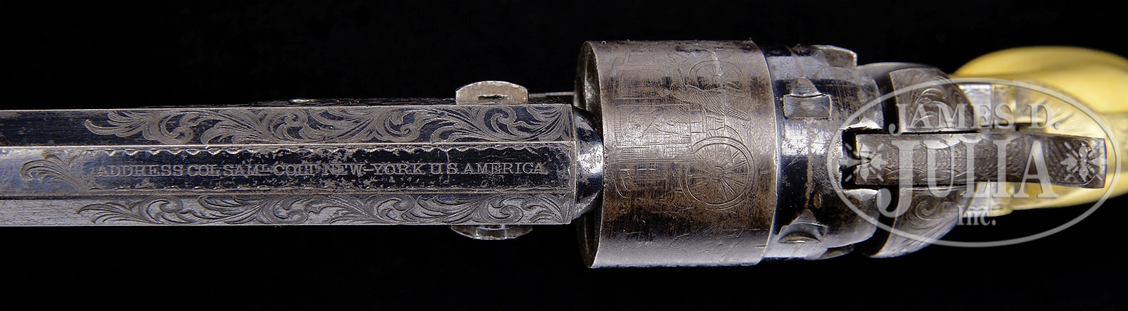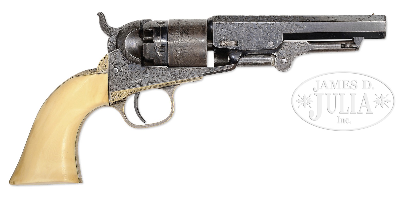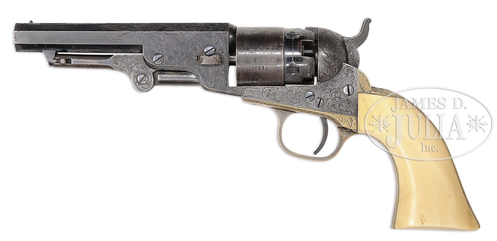 SN 6291. Cal. 36. Blue and color case hardened with 4-1/2″ oct bbl, brass pin front sight and 1-line New-York U.S. America address. left side of frame as a small “COLTS PATENT” and left rear web of trigger guard is marked “36 CAL”. Cyl is rebated with 5-chambers and stagecoach holdup scene roll marking. The silver plated brass trigger guard and backstrap contain a 1-pc ivory grip that has matching SN in backstrap channel. Revolver is beautifully engraved in donut style, probably by Gustave Young, with full coverage foliate arabesque patterns without background shading on the frame and with matching patterns about 3/5 up the bbl and on the rammer pivot. Backstrap, buttstrap and trigger guard are engraved to match with a fan pattern at top of backstrap. Hammer is deluxe engraved with a wolf’s head on each side of hammer nose, fish scale patterns on top edge & sides of spur with hand checkered spur. All 4 SN’s on bottom of revolver are accompanied by a small “E” which signifies this revolver was to receive special attention for engraving. Accompanied by a spectacular orig, brass bound Colt casing that has an empty plaque in the lid with mortised brass corners, brass reinforcements on the bottom corner and a mortised brass lock in the front. Interior is burgundy velvet lined and compartmented in the bottom for the revolver, a blued steel 2-caivty “COLT’S PATENT” mold with sprue cutter marked on the right side “36P”, a sgl sided eagle and stars, “COLTS PATENT” flask, a packet of 5 combustible cartridges, an “L” shaped nipple wrench, a lacquered tin of Eley’s caps, and a functioning key. Bottom is originally oilcloth covered. There were about 19,000 of these fine revolvers produced 1861-1873. They were mostly produced during the Civil war and remained in service throughout the war well into the 1870’s & 80’s until supplanted by cartridge revolvers. They generally saw hard service and are rarely found today with high orig finish. Cased examples are very rare and engraved cased examples are extremely rare. PROVENANCE: The William Gerber Family Collection. CONDITION: Very fine, all matching including wedge, cyl & grip, cyl spindle is unnumbered or perhaps has had the number obliterated by cleaning. Bbl retains about 85% glossy orig blue with the loss areas flaked, not worn, to a medium patina. Rammer and handle retain faint case colors in sheltered areas. Frame retains traces of case colors, being mostly a gray metal patina. Cyl retains about 25% blue in the rebated area with the balance a gray/brown patina and shows about 75% stagecoach holdup scene roll marking. Trigger guard and backstrap are mostly a medium brass patina with silver on the trigger plate. Mechanics are fine, bright shiny bore with scattered pitting. Case has grain check in the lid and a couple more in the bottom, otherwise is sound with light nicks & scratches and retains about 85% orig varnish. Interior is lightly faded with light soil under the revolver and damage from the front sight. Flask retains 65-70% strong orig finish and the mold about 90% orig blue. Cartridge packet and cap tin are fine, other accessories are fine. (WG-029) 4-51058 JR502 (25,000-35,000) – Lot 2020