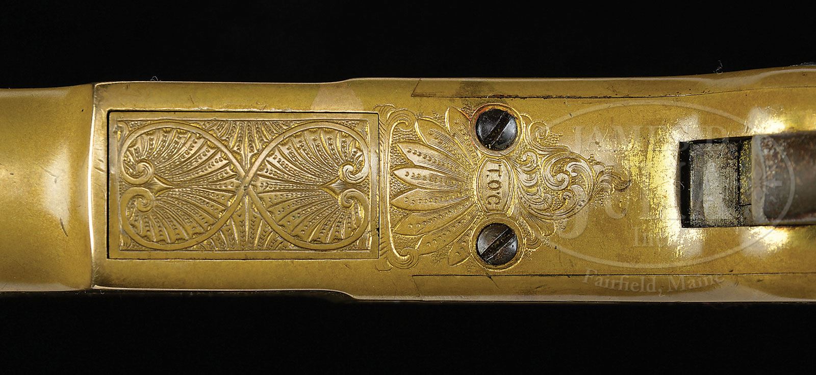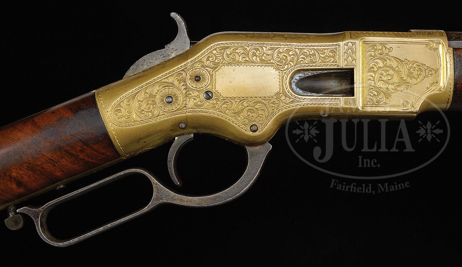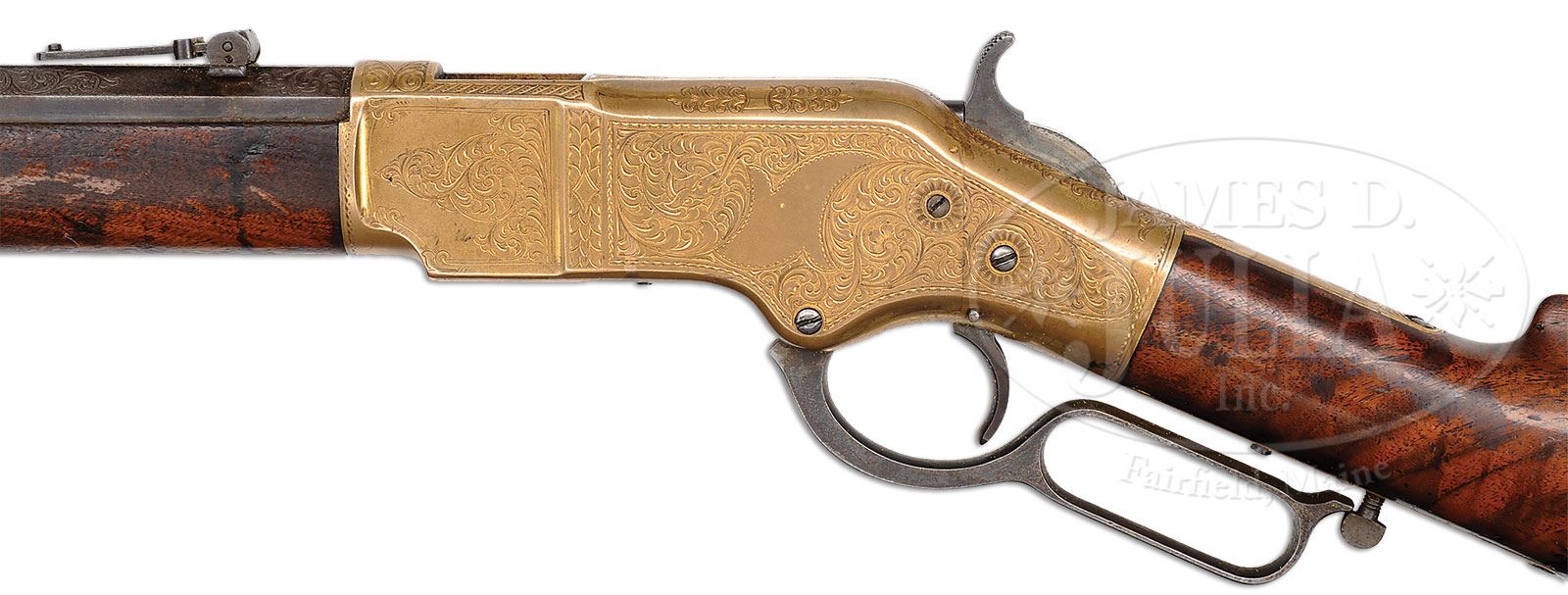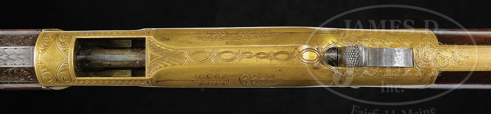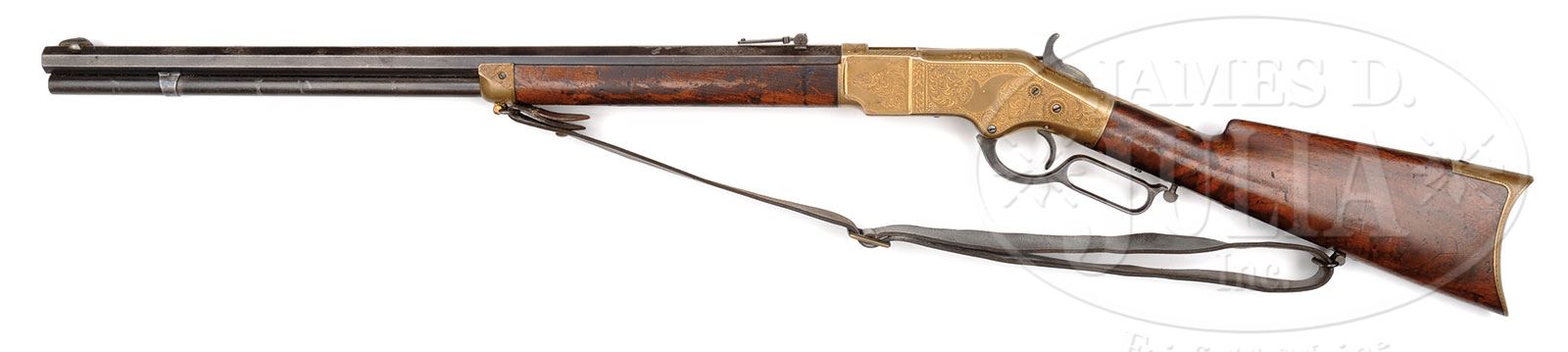 We just acquired some additional exciting information. Winchester did indeed have a salesman by the name of Thomas O’Connor. However, there was also a very skilled engraver by the name Thomas O’Connell (a rival to the reknown Nimschke). The initials on this gun, we have learned, are for the engraver, not the salesman. This is indeed great news as fine examples of his work are much scarcer than Nimschke’s. Please see online image of a copy of one of O’Connell’s business cards. EXTREMELY RARE FACTORY ENGRAVED AND INSCRIBED WINCHESTER MODEL 1866 THAT BELONGED TO WINCHESTER’S MOST FAMOUS SALESMAN THOMAS O’CONNOR.SN 43136. Cal. 44 RF Henry. Spectacular and rare 1866 rifle that belonged to the very famous Winchester salesman Thomas O’Connor. This rifle has 24-1/4″ oct bbl, full magazine, Kentucky style Rocky Mountain front sight and 900 yd Henry ladder rear sight. Mounted with very highly figured, uncheckered American walnut with straight stock and crescent buttplate with trap containing a 4-pc brass & iron cleaning rod. Buttstock & forend cap have factory sling swivels containing an orig black leather sling with brass buckle. The receiver, forend cap & buttplate tang are beautifully engraved most likely by John Ulrich. Although unsigned it has many attributes of John Ulrich’s work, most notably the rosettes around the screw holes on the receiver & side plates. The engraving consists of about 60% coverage extremely fine foliate arabesque patterns with very fine pearled background. The left side plate incorporates a dogs head in one of the scrolls at the front end and a flower blossom in a scroll at the rear end. The raised panels before the front receiver flats are engraved in fine foliate patterns. Top of the receiver is engraved in foliate, geometric and arabesque patterns with feather borders around the ejection port. Bottom of the receiver, between the timing screws, is engraved in very fine foliate & arabesque with a small elliptical panel in the center engraved “T.O’C”, the initials of Thomas O’Connor. Bottom of the carrier is fully engraved in mirror image heart shaped patterns. Top & bottom tang, forend cap along with the buttplate tang are engraved to match. This rifle also has an extraordinarily rare feature of having had 7″ of the top three flats of the bbl, forward of the receiver, engraved in geometric, foliate arabesque & foliate patterns. The receiver, forend cap & buttplate are gold-washed and the lever originally silver plated. Obviously this was intended to have been a special presentation to Mr. O’Connor or a rifle that Mr. O’Conner ordered for himself. Accompanied by a copy of Mr. Yearout’s inventory card which identifies this rifle and shows that he purchased it in 1969 from someone in his hometown of Great Falls, MT. In a one page article by Mr. Yearout, which appeared in the Spring 1984 issue of the WACA Newsletter, he details how he acquired this rifle after having originally seen it at the Orr-Poindexter Ranch near Ennis, MT. At that time the owners declined to sell it but apparently in 1969 did sell it and Mr. Yearout was able to purchase it after it had passed through two other individuals. He states in the article that after he purchased the rifle he was able to employ a researcher who discovered Mr. O’Connor’s connection to Winchester. He learned that Mr. O’Conner had run away from home at age 14 and became an employee of Remington Arms, later coming to Winchester as a young man. He was soon noticed by Oliver Winchester who eventually promoted him to become Winchester’s premier outside salesman with unlimited territory. He remained employed at Winchester for the remainder of his life. This rifle is also pictured in The Winchester Book, Madis. It is additionally pictured on p.69 of The Book of Winchester Engraving, Wilson. Mr. Wilson states that it is engraved by either L.D. Nimschke or one of the Ulrich’s. Research through several engraving books disclosed that only John Ulrich regularly applied rosettes around screw holes. Careful examination disclosed no signature on the engraving. PROVENANCE: Estate Collection of Lewis & Leyton Yearout. CONDITION: Fine, all matching. Bbl & magazine tube retain a mottled blue/brown patina; receiver, forend cap & buttplate retain traces of orig gold wash with the balance a wonderful medium mustard patina; lever shows 15-20% silver plating with the balance a dark patina; forearm has a compression fracture on the right side top edge, otherwise wood is sound with usual nicks & scratches and three streaks of chemical staining on the forearm and otherwise retains 60-70% strong orig varnish on the forearm and about 85% orig varnish on the buttstock. Mechanics are crisp; bright shiny bore. Sling is solid and flexible. Cleaning rod is fine. 4-53808 JR16 (25,000-40,000) – Lot 2020 Click here to view provenance