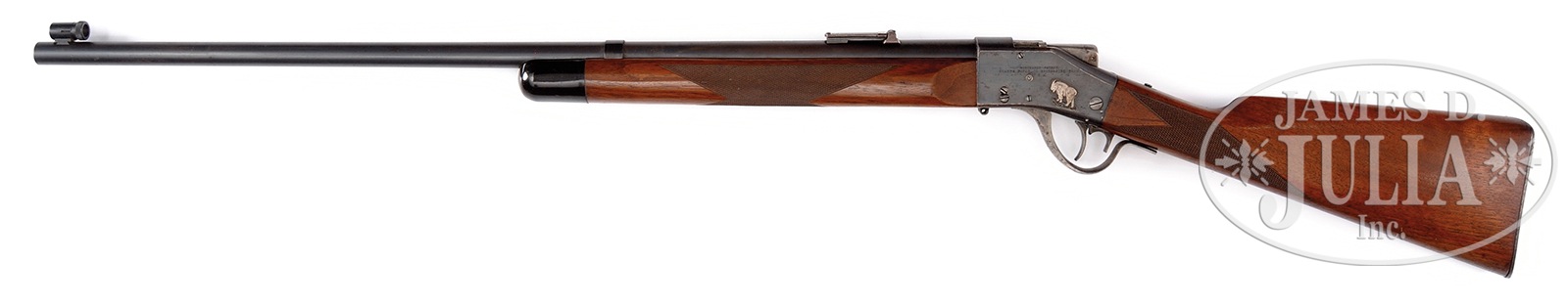 SHARPS RIFLE CO BORCHARDT SINGLE SHOT RIFLE.SN 6766. Cal. 45-70. 30″ rnd tapered sporter weight bbl. Top marked “Old Reliable Sharps Rifle Co Bridgeport, Conn”. Hammerless falling block action with Borchardt patent markings on left side. Customization includes signed addition of raised silver inlays, signed “Lewis”, featuring mountain goat on left side of action with big horn ram’s head right side. Globe front sight with graduated leaf folding rear sight. Top tang has one open sight hole with second hole filled by sight mounting screw. Wrist of stock has one plug sight attachment hole. Bbl band mounted custom walnut heavy target forearm with hand checkering and black tip. Straight grip walnut hand checkered stock utilizing orig Borchardt checkered buttplate. CONDITION: Bbl and action retain about 75% dull fading blue with spots of freckling and edge wear. Stock finish shows spots of wear with scattered scratches and marks. Very good bright bore. 51052-2 DS (3,000-5,000) – Lot 2020