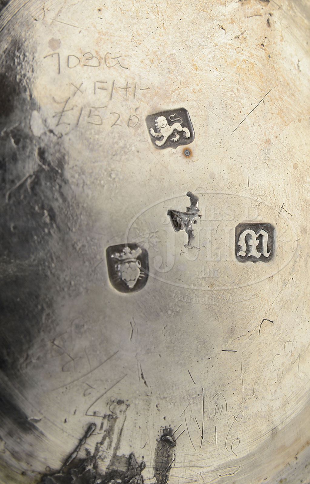 LONDON GEORGIAN STERLING COFFEE POT WITH SHUTTLEWORTH COAT OF ARMS. Baluster form body on molded pedestal base, fitted with nicely cast and decorated spout and handle mounts, has tall domed hinged cover with flame finial. Scrolled handle is of ebonized fruitwood. Body is engraved with small armorial depicting raised fist, surrounded by motto “ISTO VELOCIOR VITA”. (Shuttleworth coat of arms, as related by two notes contained in body.) Bottom is stamped with hallmarks for London, sterling, and 1767 (Makers mark obscured). SIZE: 10-1/2″ high. Dia. at base: 4-1/4″. 8″ handle to spout. 23 oz. 18.33 dwt. PROVENANCE: From a fine Kentucky Estate. CONDITION: Considerable dimpling to body. Armorial is slightly rubbed. Bottom of interior has some deep pits with two solder repairs on exterior within base. 9-92271 (1,000-1,500)