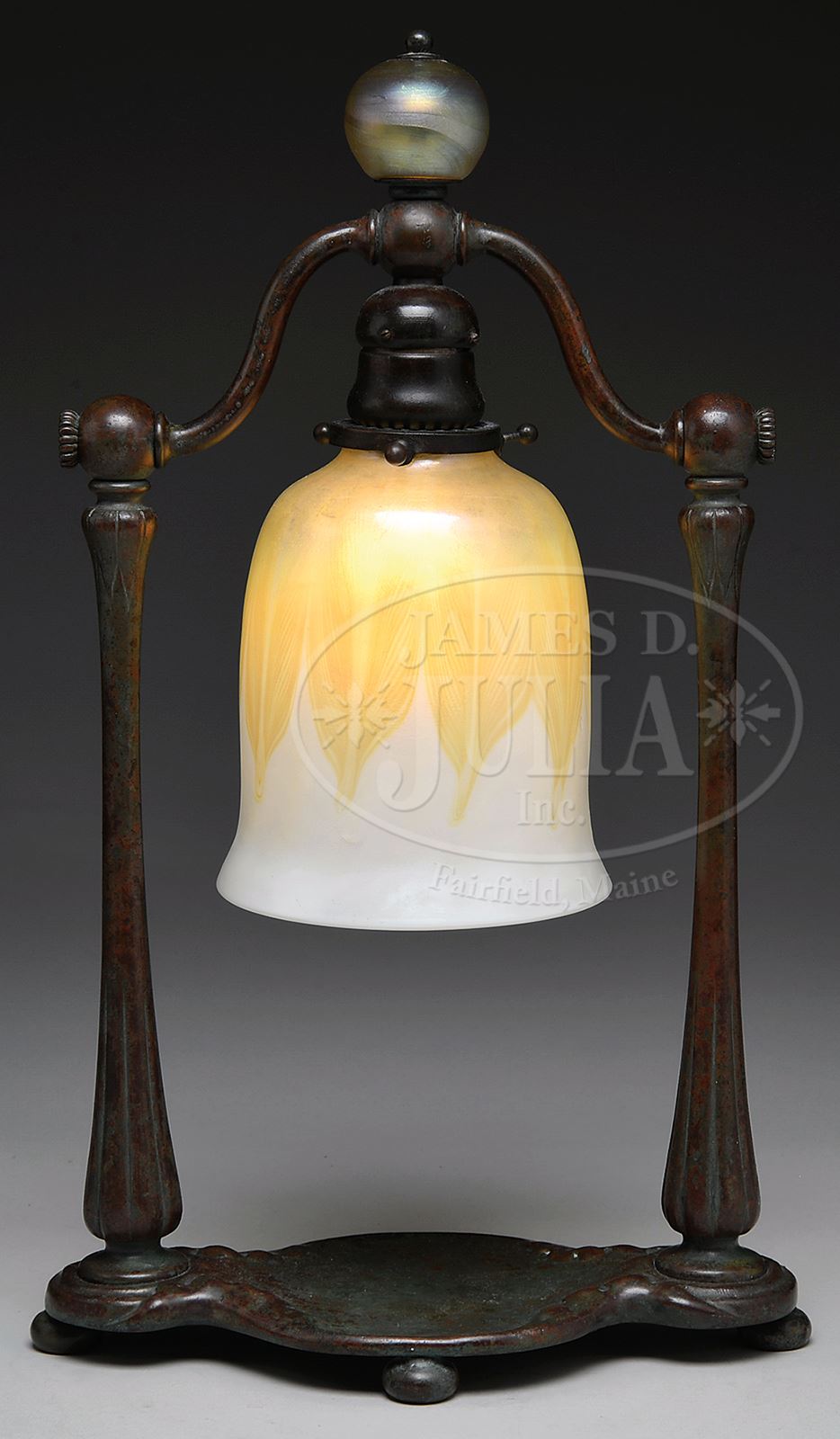 TIFFANY STUDIOS LIBERTY BELL LAMP.Tiffany desk lamp has favrile glass shade with iridescent yellow pulled feather design descending from the fitter against a creamy white lightly iridescent background. Shade rests within the bell holder base with vertically ribbed arms extending upward on each side of the organic Art Nouveau platform. Arched top secures the shade and is finished with a gold Favrile glass ball finial. Base is finished in a rich brown patina with strong green highlights. Shade is unsigned but numbered “E2561”. Base is signed “Tiffany Studios New York 448”. SIZE: Shade is 5-1/2″ dia x 6-1/2″ t. Lamp is 18-1/2″ t. CONDITION: Very good to excellent with small bruise to inside lip of fitter. 50393-1 (9,000-12,000) – Lot 2021
