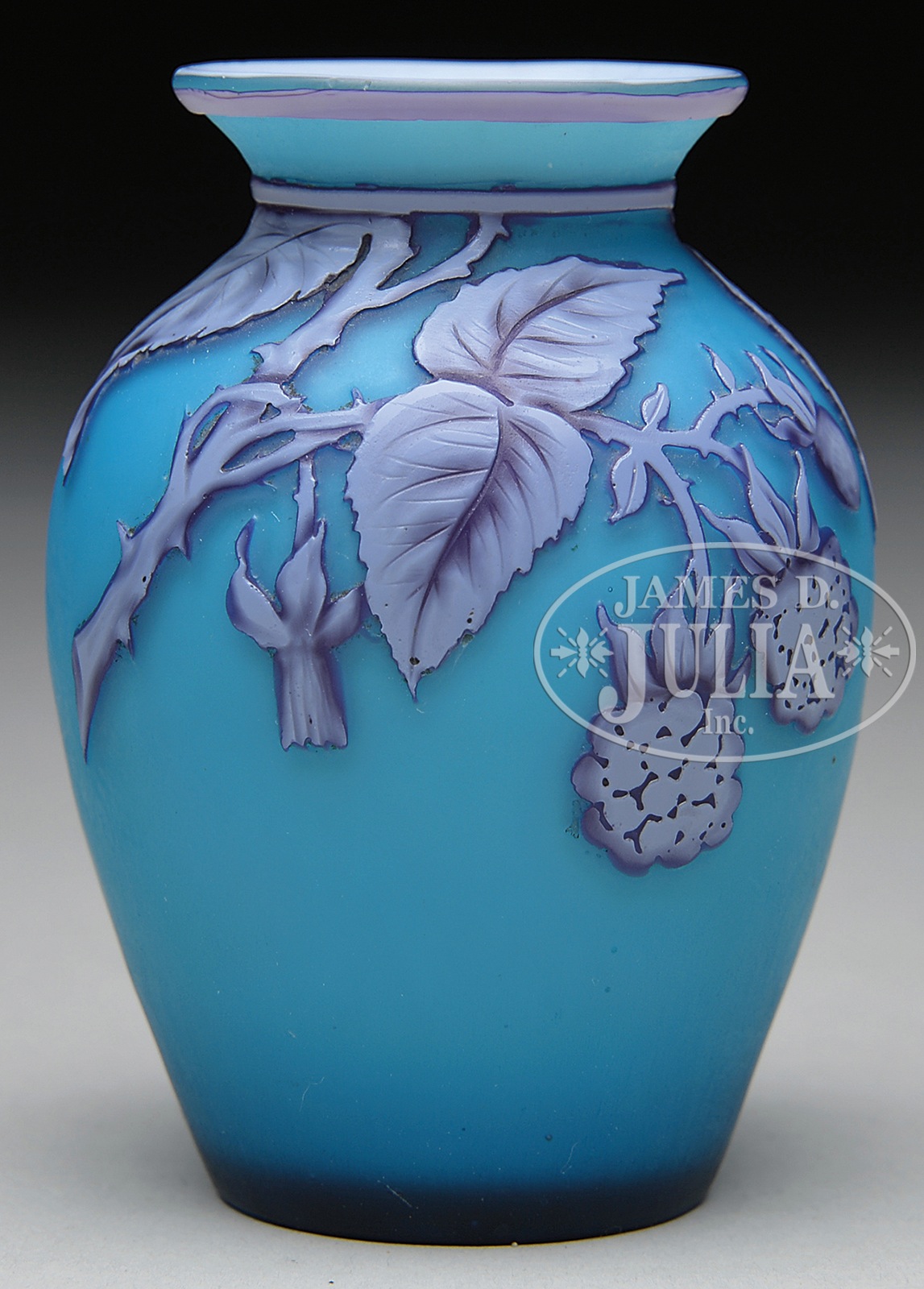 ENGLISH CAMEO VASE.Stunning miniature English cameo vase attributed to Webb is decorated with nicely detailed white and purple cameo flowers, stems, leaves and berries against a rich blue background. Vase has a cased white interior. Unsigned. SIZE: 3″ t. PROVENANCE: Linda Southworth Collection. CONDITION: Very good to excellent. 5-68273 (1,500-1,800) – Lot 2022