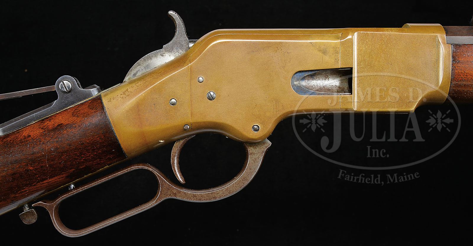 SN 16124. Cal. 44 RF Henry. Standard rifle with 24-1/4″ oct bbl, full magazine, Beach’s style combination front sight, 900 yd Henry ladder rear sight and a thick base sporting tang sight with 4″ staff. Top tang has had a 2nd hole drilled & tapped for the tang sight. Mounted with uncheckered, straight grain American walnut with straight stock and crescent buttplate with trap. Buttstock & forend cap have factory sling swivels which contain an orig brown leather sling with brass buckle & stud. Left side of lower tang, under the wood, is marked with the serial number and “RV”. Matching serial number is inside toe of buttplate. The top tang channel of the buttstock has been altered to accommodate the 2nd screw which obliterated the serial number that would have been found there. However there is no doubt in this catalogers mind that this stock is orig to this rifle. The wood to metal fit around the receiver & buttplate are near perfect. Top flat of bbl has the 2-line Henry’s & King’s patent address. These early 1866 rifles were the successor to the Model 1860 Henry rifle which is serial numbered well into the 14,000 serial range. The model 1866 production began probably in the late 12,000 serial range with limited production until about 14,000. Various publications indicate that the Model 1866 production began at around 12,475 which would indicate this rifle was made in 1868 at a time of the Great Westward Expansion of Manifest Destiny when any repeating rifle was in great demand on the frontier. Those rifles are rarely ever found with high orig finish. CONDITION: Fine to very fine. Bbl & magazine tube retain 25-30% thin orig blue, stronger in sheltered areas with the balance turning plum; receiver & side plates are extraordinary, showing very light sharp edge wear and retaining a wonderful, smooth, even dark mustard patina. From all appearances the side plates may have never been removed. Left side plate has one small scratch. Stock has a small crack in the toe with bruises on the left side by the sling swivel, otherwise wood is sound and shows normal handling nicks & scratches and retains about 75% light added finish. Mechanics are crisp; bright shiny bore with one tiny spot of fine pitting. 4-51319 (20,000-30,000) – Lot 2022