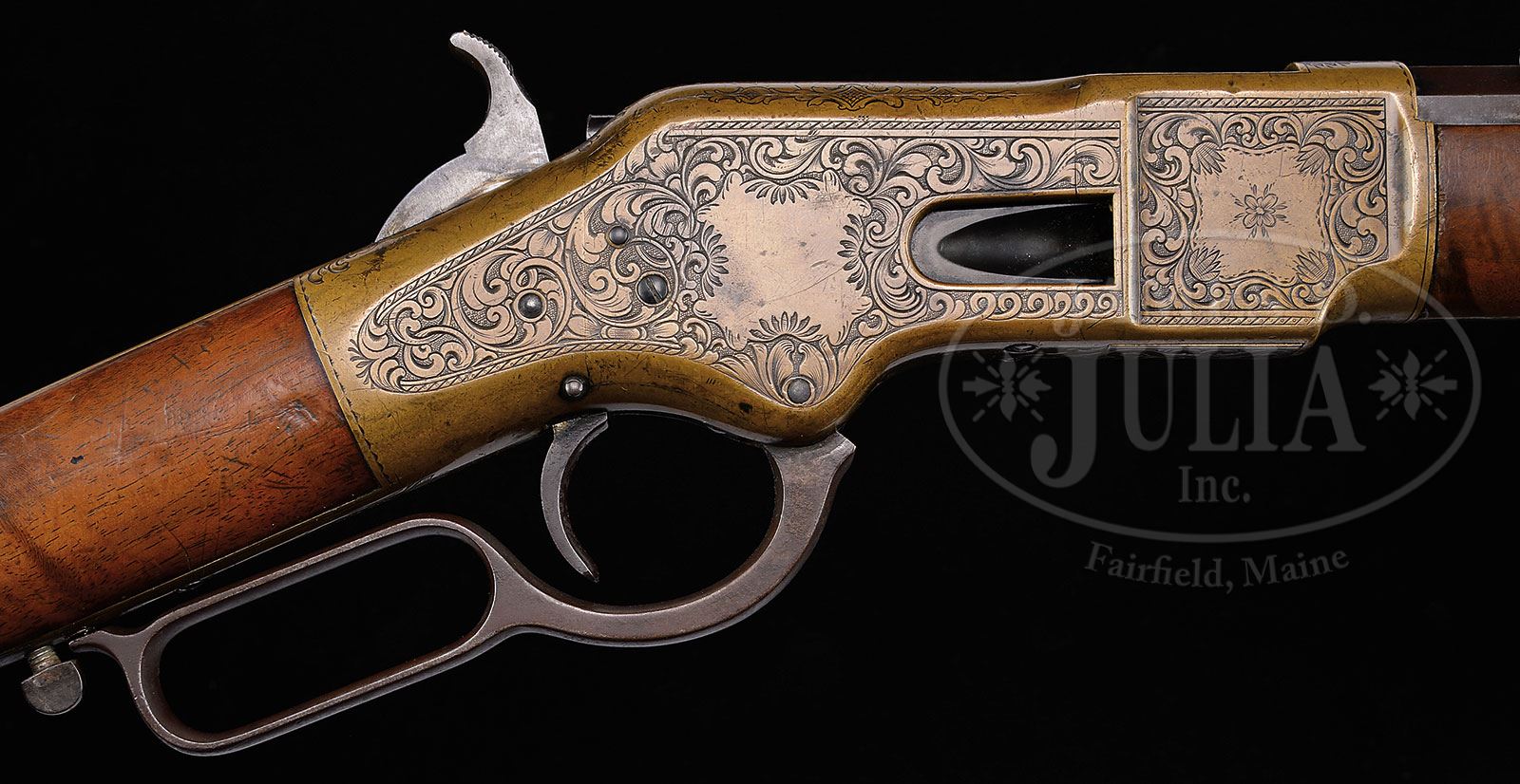 VERY RARE ENGRAVED WINCHESTER EARLY 3RD MODEL 1866 LEVER ACTION RIFLE.SN 36463. Cal. 44 RF Henry. Beautiful, special order ’66 with 24-1/4″ oct bbl, full magazine, thinned half nickel front sight and 900 yd reproduction Henry ladder rear sight. Mounted with about 2X, flame grain, uncheckered, tiger striped American walnut buttstock with burl grain forearm and straight stock, that has crescent brass buttplate with trap. Left side of lower tang, under the wood is marked with numbers “34”, a “B” and “XX”. Last four digits of matching serial number are found in top tang channel of buttstock and inside toe of buttplate. Buttplate also has matching #”34″ inside the toe. Receiver, forend cap & buttplate tang are spectacularly engraved by an unknown artist from the period of this rifle. Engraving is of the highest quality with a few similarities to some patterns incorporated in engravings by John Ulrich, but only a few. Whoever the artist happened to be, was very talented and equal to, or superior to, the masters of his day in the 19th century. There is a possibility that this rifle could have been engraved by Gustave Young, as there are some similarities to his work. A diligent search, under magnification did not disclose a signature. Engraving consists of nearly full coverage intertwined foliate arabesque patterns with open counterpoint panels and a rope style border on top & bottom edges on both sides reminiscent of Gustave Young. Left side has a very elaborate flower blossom and leaf patterns just above the lever screw. Front side panels are identically engraved with open counterpoint panels that have a small flower blossom in the center and foliate patterns at each corner. The area below the loading gate on the right side has a very unusual spiral pattern. Matching patterns extend over the top of the receiver and top tang with elaborate foliate sprays on the receiver ring and behind the hammer slot. Bottom of the carrier is engraved in Moorish patterns. Forend cap, possibly an old replacement is engraved by a different hand. Buttplate tang is engraved by the same hand as the receiver. Regardless of the forend cap, this is an extraordinary example of the engraver’s art. CONDITION: Fine to very fine. Bbl & magazine tube retain blue in sheltered areas being an overall chocolate brown patina showing light edge wear, a few small nicks and three or four small areas of pitting; receiver & buttplate retain a wonderful aged brass patina showing moderate edge wear; wood is sound with numerous small nicks, scratches and light bruises and overall retains about 80-85% orig varnish, showing wear on the forearm at the carry point. Mechanics are fine; dark bore with sharp rifling and scattered pitting. 4-50388 JR439 (20,000-25,000) – Lot 2023