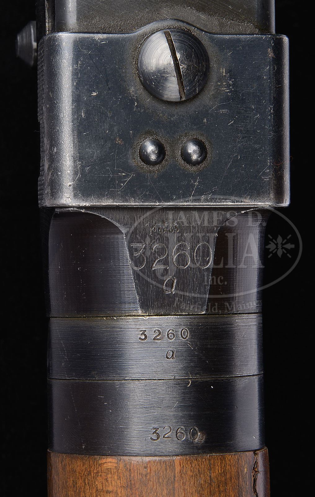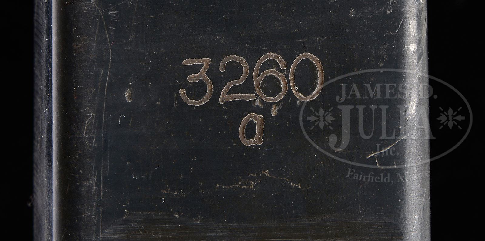 **NEARLY ALL MATCHING GERMAN WWII MG 34 MACHINE GUN (C&R).SN 3260a. Cal. 8mm, bbl 28″. This MG 34 machine gun was made by Waffenwerke Brunn (dot) in 1944 as indicated on top of bbl shroud. Eagle over WaA 63 proofmark is also on top of receiver above SN. Bbl shroud, top cover, receiver, buffer, shoulder stock cup and wooden shoulder stock as well as handgrip all match in SN. Charging handle has no number visible when on gun. Bipod has eagle over WaA proofmark but no apparent SN. Feed shuttle mechanism also has very clear eagle over swastika and WaA 63 mark but no apparent SN. Bolt is matching in number and manufacturer (dot) to rest of gun with 3260a SN and eagle over 63 proofmark. Bbl and feed tray are the only parts which numbers do not match this gun. This indicates very strongly that this was a GI bringback gun. Firing mechanism functions smoothly when operated by hand. This weapon appears fully functional. PROVENANCE: The class III weapons formerly on loan to Evergreen Aviation & Space Museum. CONDITION: Overall finish and appearance is fine with about 90% original blued finish remaining with the loss being mostly on the charging handle, feed tray and thinning in places with some bare areas along the high points. Bipod presents more of a brown patina finish with some old scale in places. Hand grips appear intact and serviceable with some scuffs and handling marks. Stock has some chips and scratches but is still very serviceable. Bore has strong rifling. Bolt face is clean with crisp edges with a slight ring around the firing pin hole. It is fairly routine to find bringback guns with non-matching parts and very unusual to find one of these guns so close to all matching as this one. 4-51689 (20,000-30,000) – Lot 2023