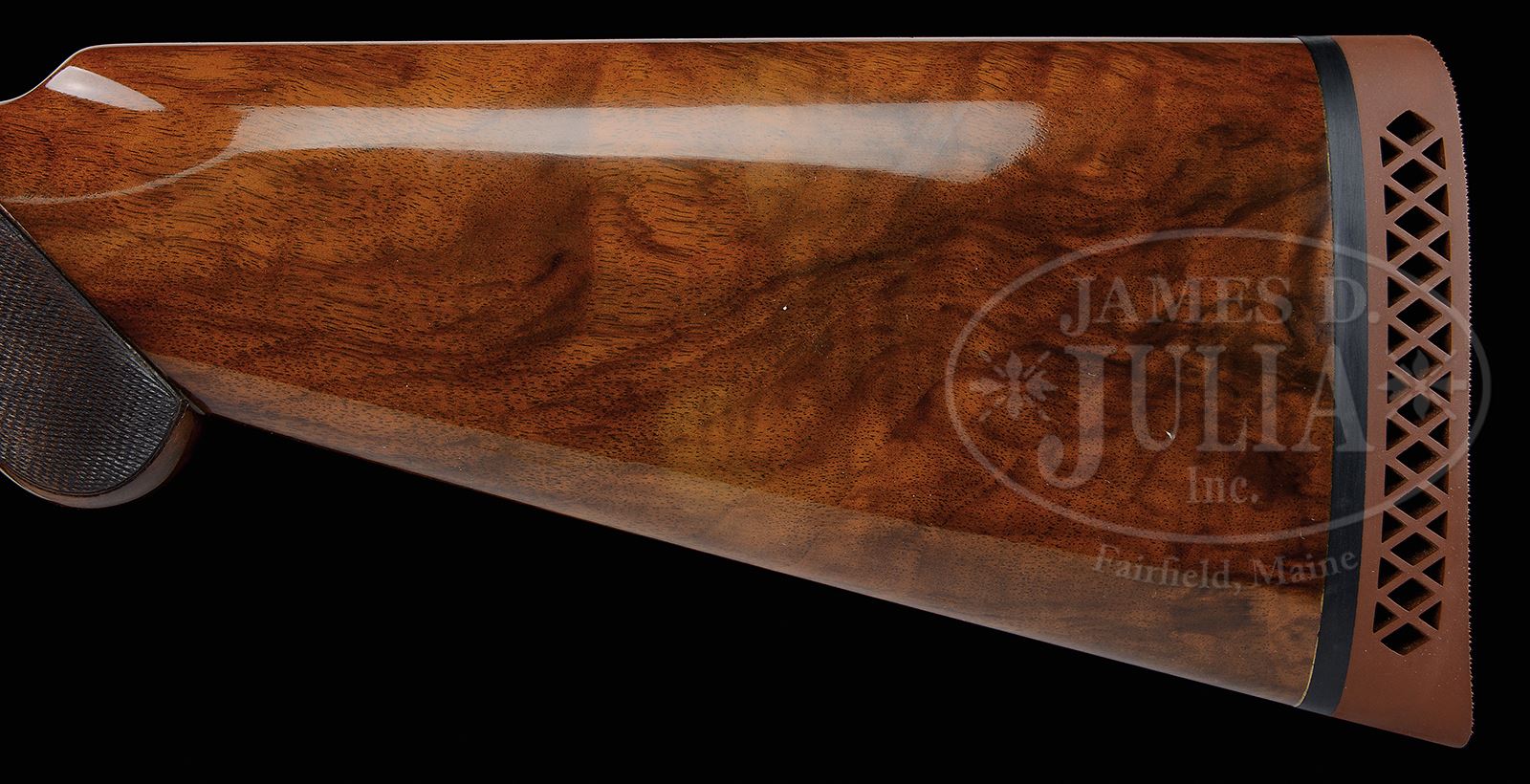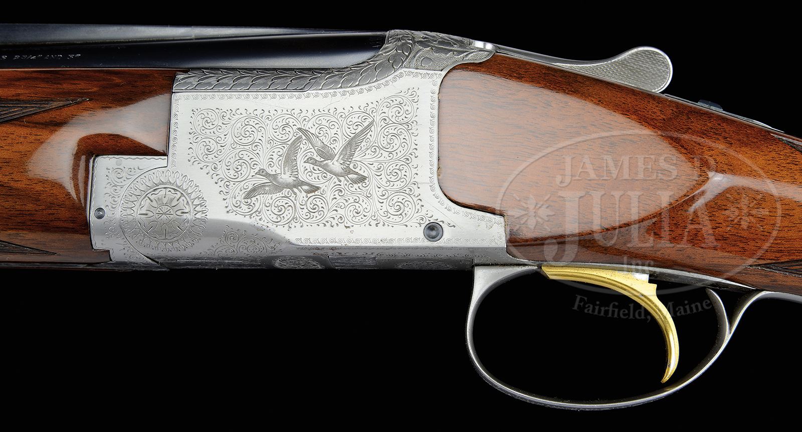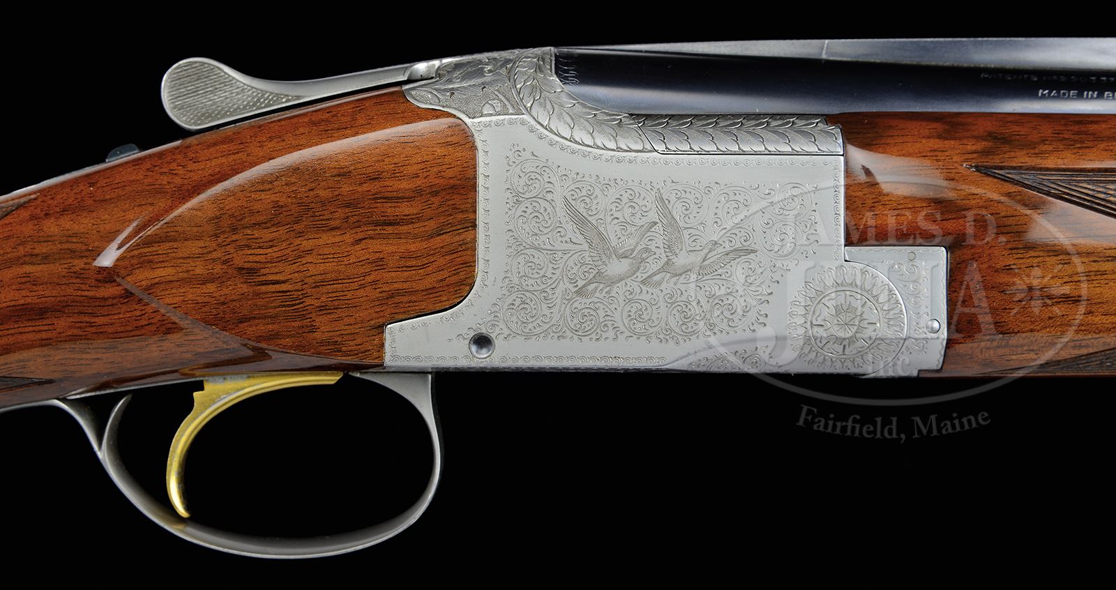 *EARLY 20 GAUGE BROWNING PIGEON GRADE SUPERPOSED.SN 26145V2. Cal. 20 ga. 3″ Chambers. 26-3/8″ Bbls are marked for skeet and skeet, with matted, ventilated rib and Browning St. Louis and Montreal addresses. Coin finished action is engraved in usual “Pigeon” style, with pairs of pigeons flying through light scroll background on sides, with rose bouquets on bottom. Top of action is relief carved with well cut oak leaves and acorns. Trigger guard is scroll engraved. Smoky marbled and nicely figured European walnut long tang round knob buttstock measures 14-1/16″ over Browning open sided pad, and features point pattern checkering with line borders at grip. Forend matches very well. Bore diameter: top -.613, bottom -.608. Bore restrictions: top: -004 (skeet), bottom: -002 (skeet). Drop at heel: 2-3/8″, drop at comb: 1-9/16″. Weight: 6 lbs. 4 oz. LOP 14-1/16″. PROVENANCE: Rod Fuller Estate Collection. CONDITION: Excellent, retaining nearly all factory type finishes on wood and metal, with a few light handling and assembly marks on bbl. Coin finish is excellent. Stocks are excellent with one or two minor pings. Gold of trigger has some rubs on sides and some finger wear. Mechanically excellent. 49114-11 MGM180 (5,000-8,000) – Lot 2023