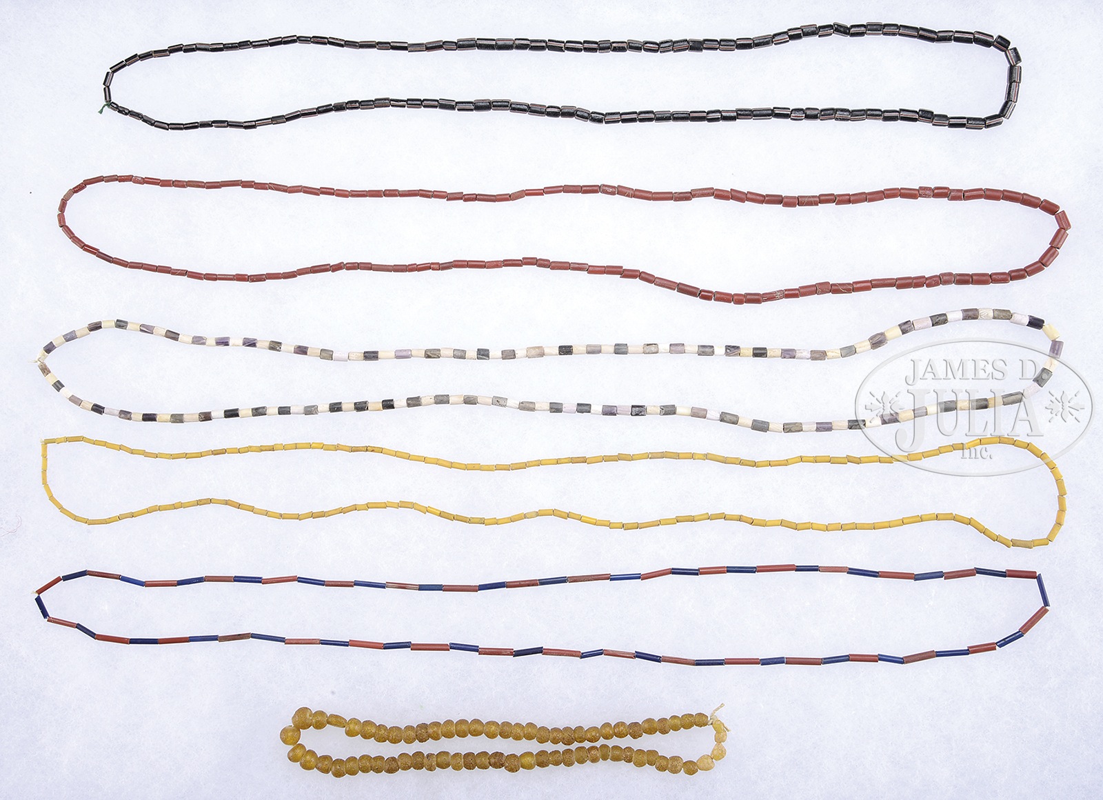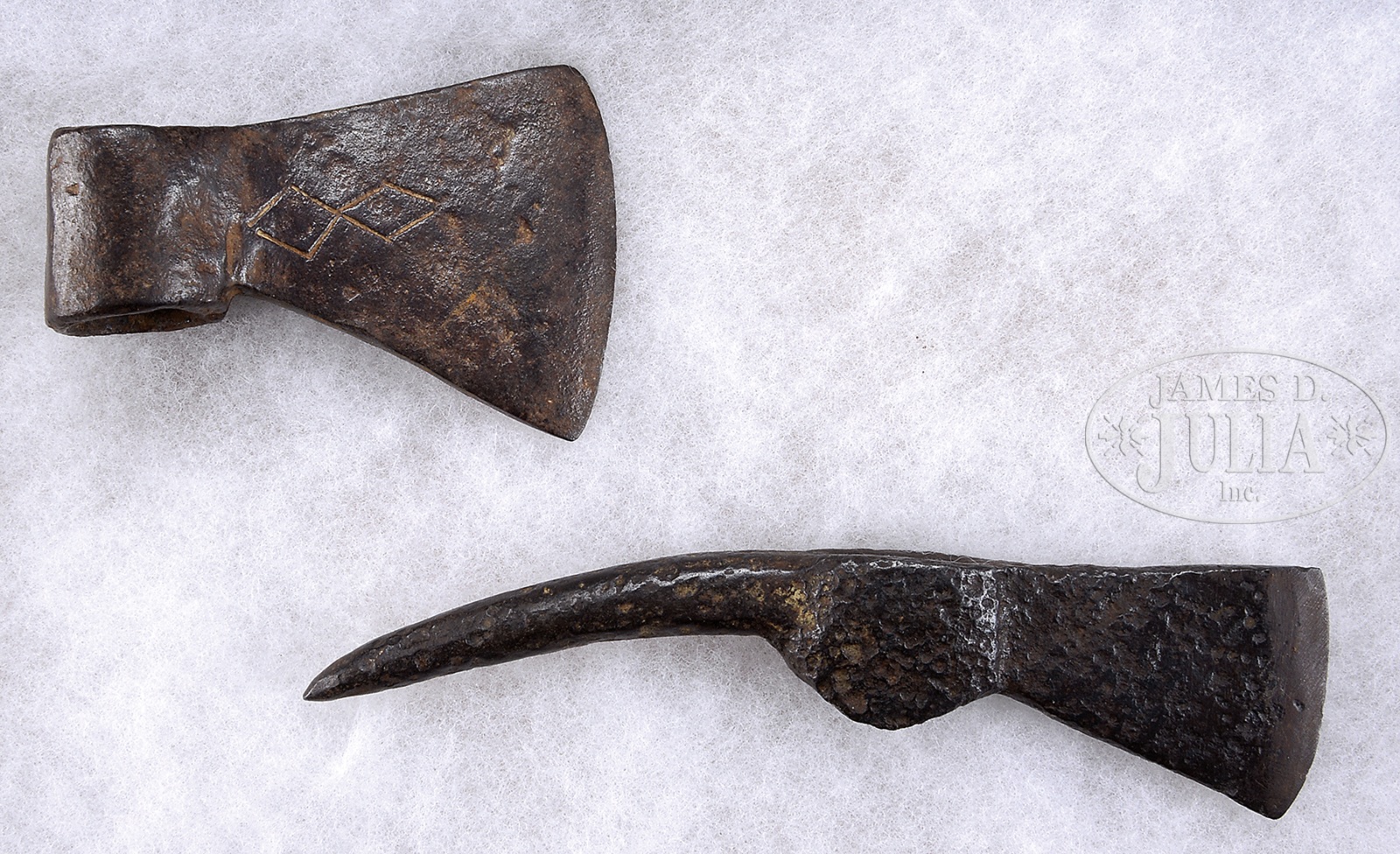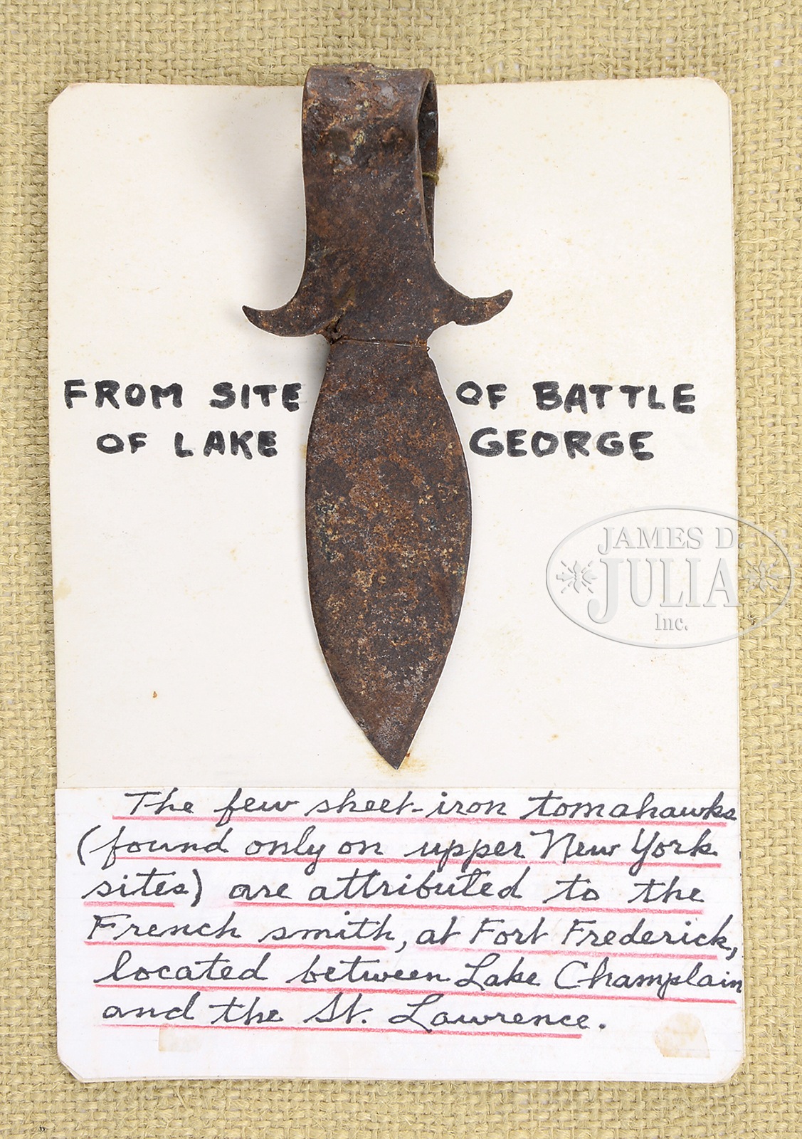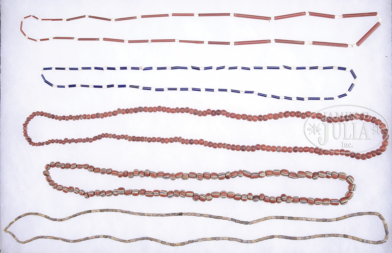 LARGE GROUPING OF EXCAVATED INDIAN TRADE BEADS, WAMPUM AND TRADE AXES.This grouping from the the Toffolon Collection consists of 11 reconstructed strings of trade beads excavated at various Indian sites. Most are from Bloomfield, Ontario County, New York at various identified sites there, such as Marsh, Steele, Baughton Mill, Valley Mill and others. Each strand averages about 100 beads and are of different types, color and manufacture. The three small trade axes include a spontoon head tomahawk that is mounted on a board that states they are attributed to a French blacksmith at Ft. Frederick and are found only in Upper New York. PROVENANCE: Estate of Siro R. Toffolon, of Old Lyme, CT. CONDITION: Beads are very good overall as excavated. Three small trade axes which measure between 5″ and 7″ are rusted and pitted. 49476-121 (400-800) – Lot 2023