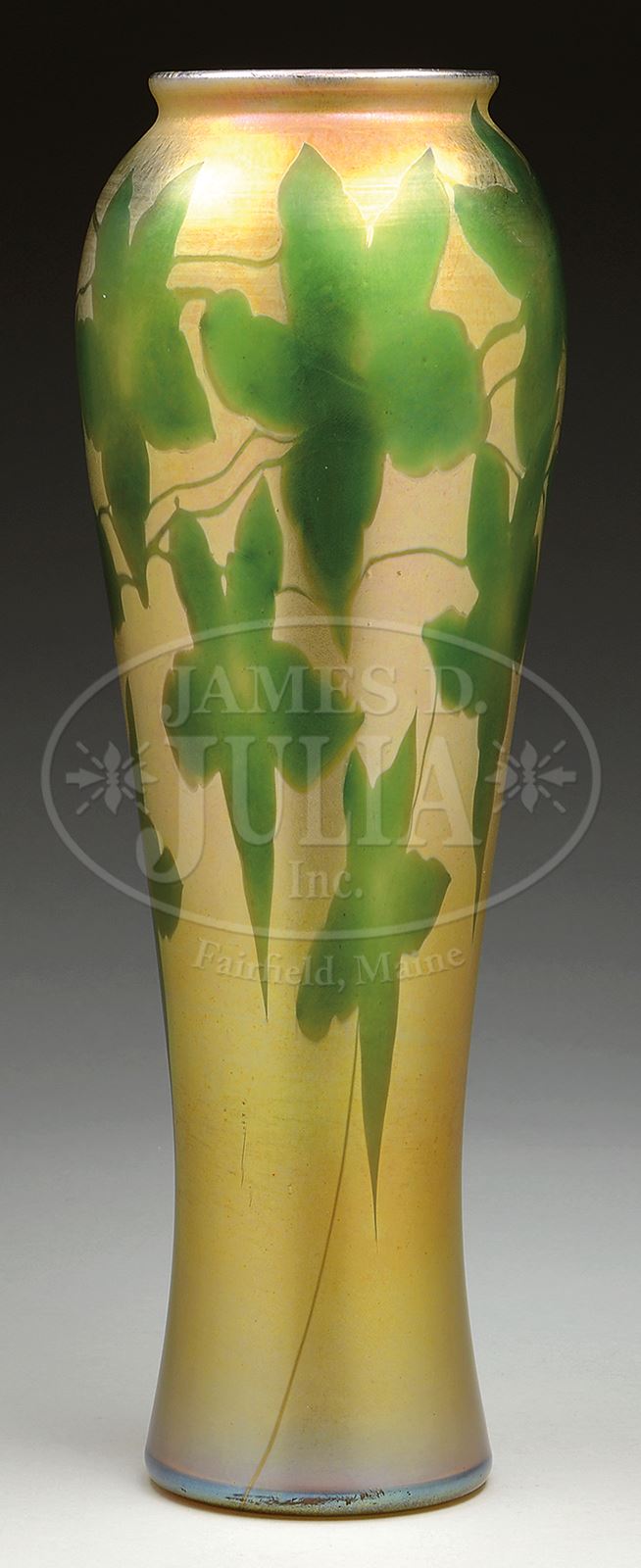 Large Tiffany gold favrile vase has green leaf and vine decoration with large leaves and delicate vines against a bright gold iridescent background. Signed on the underside “L.C.Tiffany-Favrile 688 E”. SIZE: 14-3/4″ t. CONDITION: Very good to excellent with some minor scratches to iridescence on edge of foot. 50393-2 (5,000-7,000) – Lot 2024