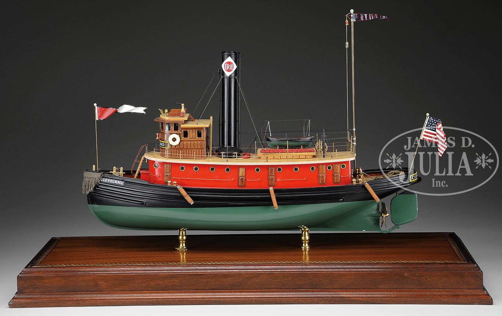CASE MODEL OF THE TUG BOAT “CLEVELAND”.Late 20th century U.S. Well crafted wooden model of a tug boat with tall pilot house and stack with the emblem “Erie”. Deck mounted with lifeboat, ropes, bumpers and flags. Cased in a brass bound case with inlaid detail with mahogany base. SIZE: 21″ X 32-3/4″ X 11-1/4″. CONDITION: Very good. 9-94130 (1,500-2,500) – Lot 2025
