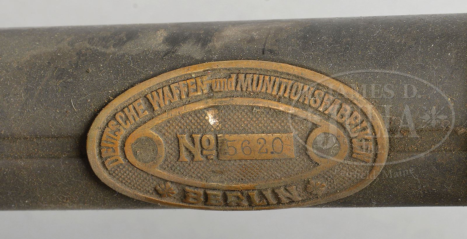 **DWM MAXIM MODEL 1910 HEAVY MACHINE GUN MADE FOR THE GOVERNMENT OF COSTA RICA (C&R).SN 5623. 7 mm. 24″ bbl. Made by DWM under contract for Costa Rica on orig DWM tripod SN 5620. Water jacket, feed shuttle, top cover, backplate, fusee cover retaining plate, muzzle and cross bolt are all matching. Bolt is numbered 5629A from same production run and likely swapped out when guns were all together in Costa Rica. Marked on fusee cover “DEUTSCHE WAFFEN-UND MUNITIONSFABRIKEN BERLIN 1910”. Top cover displays a very attractive Costa Rican crest. Cork and chain plug for drain is not present. Mechanism functions smoothly when operated by hand. This weapon appears fully functional. PROVENANCE: The class III weapons formerly on loan to Evergreen Aviation & Space Museum. CONDITION: Overall finish and appearance is fine. 75% blue mostly turning to brown patina on water jacket and feed shuttle. Also loss of finish to high points and tripod attachment collar which shows as gray metal with some brown patina. Numerous scratches and light pitting on water jacket. Backplate wooden handles are cracked with some significant loss due to chipping particularly on left handle. Checkering is much worn. Also significant pitting to metal hardware of handles but they are still very serviceable. Bore is excellent, shiny and bright. Bolt face is excellent. Tripod retains about 60% of its orig dark green paint with significant chipping to legs and loss of finish to brown patina on elevation gear; attachment for knee pads not present; data plate marked “DEUTSCHE WAFFEN-UND MUNITIONSFABRIKEN BERLIN 1910”; traverse and elevation mechanism stiff but functional. This gun shows evidence of use and firing and is an excellent example of DWM quality. 4-51740 (14,000-20,000) – Lot 2025