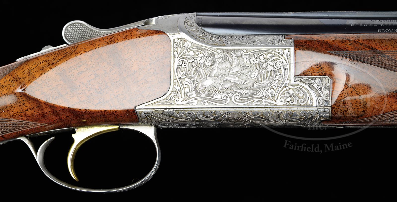 *20 GAUGE BROWNING SUPERPOSED P 2 M LIGHTNING ENGRAVED BY J. BAERTEN WITH CASE.SN P33RR1400. Cal. 20 ga. 3” Chambers. 26-3/8″ Bbls are marked for skeet and skeet. Bbls have narrow, ventilated rib and sgl silver bead. They are marked with Browning Morgan Utah and Montreal addresses, and “MADE IN BELGIUM” on left, and “BROWNING SUPERPOSED”, steel and chamber info on right. Coin finished rounded Browning OU action with gold-plated sgl selective trigger, is engraved with near full coverage of well cut large open shaded scroll with acanthus highlights surrounding well detailed scenes of game birds; three pheasant fly through woodland on left, and a trio of ducks rise from marsh on right, a pair of quail fly across bottom of action. Trigger guard has matching scroll. Both side scenes are signed “J. Baerten”. Burl figured European walnut long tang flat knob buttstock measures 14-1/8” over Browning open sided white line pad. Modified point pattern checkering wraps over top of grip. Matching forend is of 1-pc field type. Bore diameter: top -.619, bottom -.619. Bore restrictions: top: .003 (skeet), bottom: .003 (skeet). Drop at heel: 2-1/8″, drop at comb: 1-7/16″. Weight: 6 lbs 1 oz. LOP: 14-1/8″. Mottled brown vinyl Browning case is lined in off white faux fleece with a key inside. PROVENANCE: Rod Fuller Estate Collection. CONDITION: Excellent, near new, with evidence of light field use, with only a few light handling marks on wood and metal. Coin finish of action shows some areas of browning in background. Gold is fine with some loss on trigger blade. Mechanically excellent. Case is excellent, with slightly soiled interior. Browning factory records indicate that 207 “Presentation series” guns were made in this type, only 52 in this grade. 49114-38 MGM237 (6,500-9,500) – Lot 2029