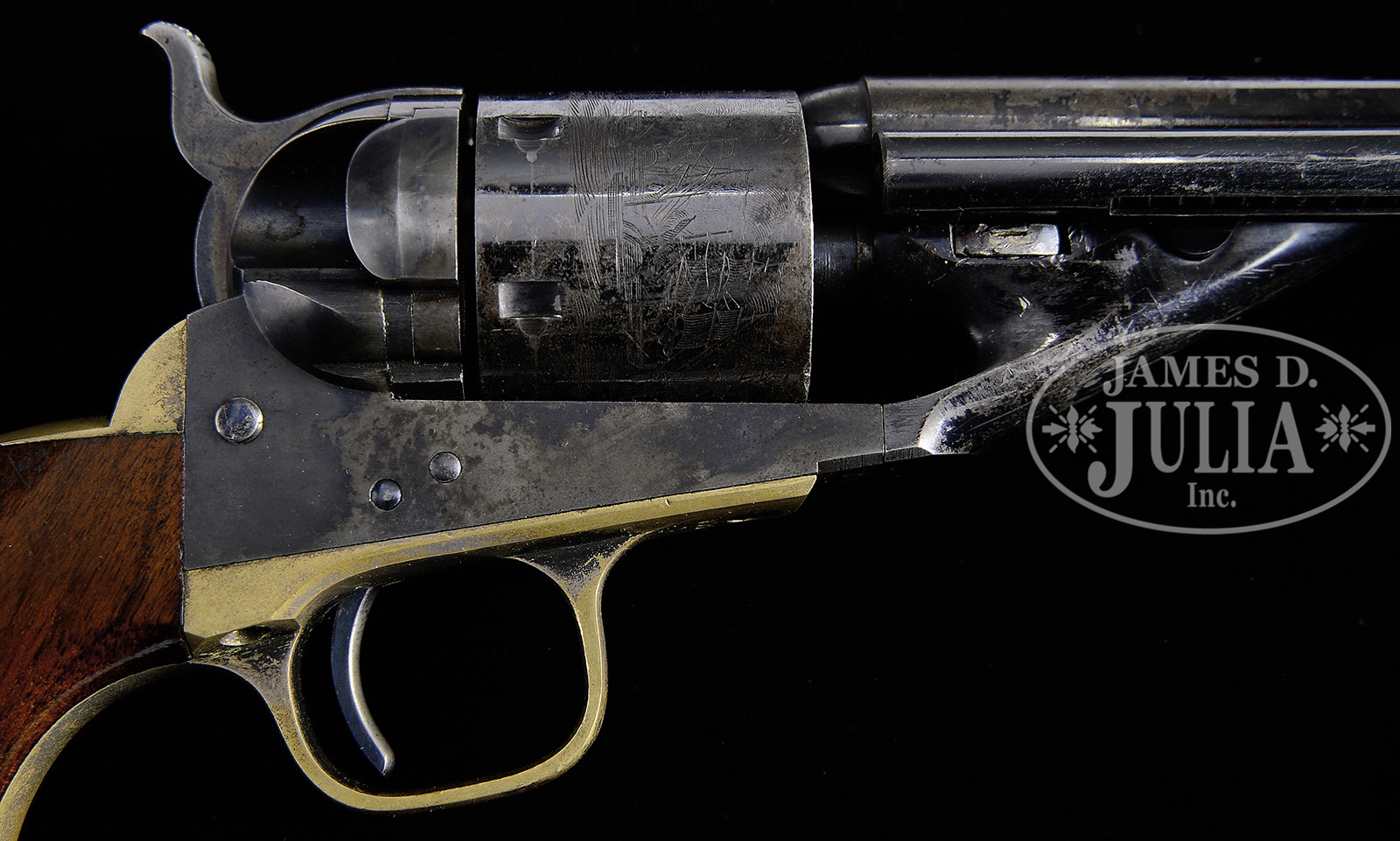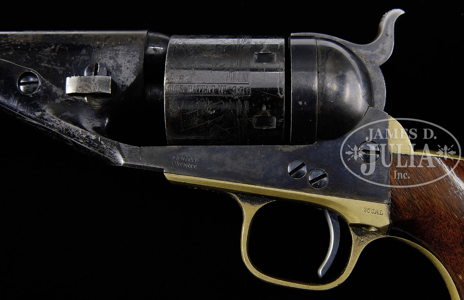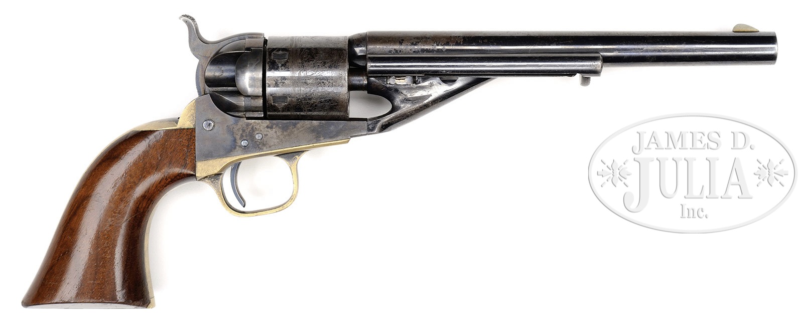 SCARCE COLT MODEL 1861 NAVY CONVERSION REVOLVER.SN 908. Cal. 38 RF. Blue and color case hardened with 7-1/2″ rnd bbl, German silver front sight and 1-line block letter “NEW YORK U.S. AMERICA” address. Left side of frame is marked with a small “COLTS PATENT” and left shoulder trigger guard is marked “36 CAL”. Cylinder is usual 6-chambers with Ormsby naval battle scene roll marking. The silver plated brass trigger guard and backstrap contain a varnished 1-pc walnut grip with matching SN in backstrap channel. Hammer has the firing pin attached to the left side of the nose with 2 rivets. According to The Book of Colt Firearms, Wilson, there was a total of about 2,200 Model 1861 revolvers converted using the Richards-Mason style. Mr. Wilson estimates that there were only about 400 produced in rimfire and 1,800 in center fire. There were about 1,400 of the 2,200 revolvers produced out of previously unused parts and about 1,000 converted for the U.S. Navy all in the mid 1870s. These civilian revolvers were all sold, primarily to a population hungry for any cartridge repeating arm. Most all of them saw hard and continuous service on the American Frontier, well into the late 19th century and are rarely found today with high orig finish. PROVENANCE: The William Gerber Family Collection. CONDITION: Very fine to extremely fine, all matching except wedge, which is properly unnumbered. Bbl retains 80-90% glossy orig blue with the only losses over the to of the bbl at the cyl end from flaking, not wear. The loss areas are a smooth medium patina. Frame and hammer retain virtually all of their strong, orig case colors showing light wear on the left recoil shield and loading gate. Top of edge of hammer has turned dark. Cyl retains about 60% flaked orig blue with the loss areas a medium to dark patina and shows about 98% Ormsby naval battle scene roll marking. Trigger guard and backstrap retain traces of silver plating, being mostly a medium mustard patina. Grip has chipped toes, othewise is sound showing light edge wear and retains most of its orig varnish. Mechanics are crisp, strong bright bore with moderate pitting. (WG-012) 4-51095 JR357 (15,000-20,000) – Lot 2031