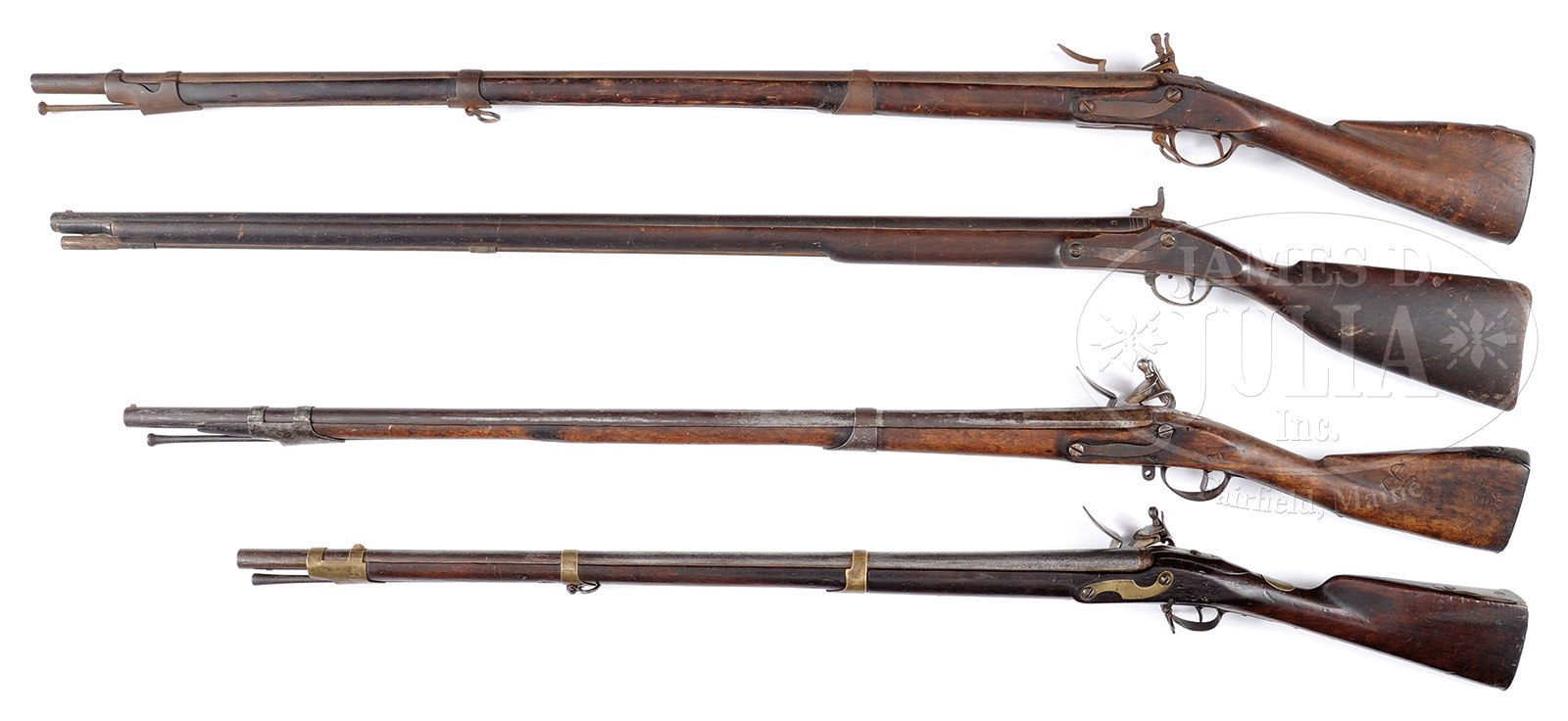 COLLECTION OF FOUR EUROPEAN MILITARY FLINTLOCK MUSKETS.1) Germanic brass mounted 18th century 50″ overall fusil. Markings worn and indiscernible. Honest Revolutionary War era 69 cal. smooth bore. Appears complete and functional with good patina. 2) Revolutionary War era French flintlock musket with “ST ETIENNE” marked lock. 44-1/2″ 70 cal. smooth bore barrel. 3) European percussion conversion military musket with 43-1/2″ round barrel with pinned stock. Decorated brass trigger guard. Large club buttstock made without buttplate. 4) Composite flintlock musket with 40-1/2″ unmarked octagonal to round barrel with two Austrian-style bands. Lock is marked “TOWER” with a crown. CONDITION: 1) Iron overall grey with staining and pitting. Brass has dark mustard color. Stock has hand worn patina and contemporary repairs when gun was altered to this 36″ configuration with bayonet lug. 2) Appears complete and functional with well worn solid stock, with numerous cosmetic defects. Metal overall is dark grey/brown with rust and pitting. Barrel proof and lock marks are partially discernible. 3) Sound and solid functional lock. No discernible lock markings. Barrel proofs not discernible. Appears to be a composite of parts, possibly American stocked in early 19th century. Metal dark with pitting. Wood ramrod with iron worm appears original to time of use. 4) External lock components are replacements. Lock is functional. 52222-10 (1,500-2,000) – Lot 2031