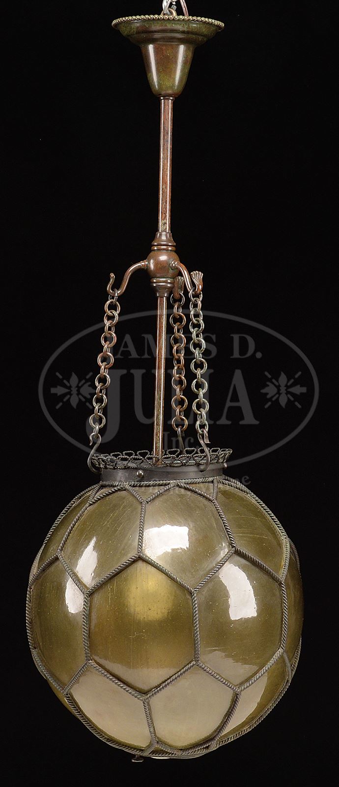 GLASS LEADED BALL HANGING LAMP ATTRIBUTED TO TIFFANY STUDIOS.Large leaded glass ball attributed to Tiffany Studios has amber glass bent panels. The lead lines are covered by applied bronze twisted rope bands and the ball has a bronze collar with twisted rope trim and three bronze hooks. Bottom of the ball has a trap door for replacing bulb. Door is set with a white opalescent turtleback tile. Ball is suspended by three bronze chains which attach to a Viking ball in the center of a single bronze rod supporting single socket and top with bronze ceiling cap with beaded trim. Bronze hardware is finished in rich brown patina with green highlights. Hardware and shade are unsigned. SIZE: Ball is 14″ dia. Approx 36″ from ceiling to bottom of ball. CONDITION: Very good to excellent. 50398-14 (6,000-8,000) – Lot 2033