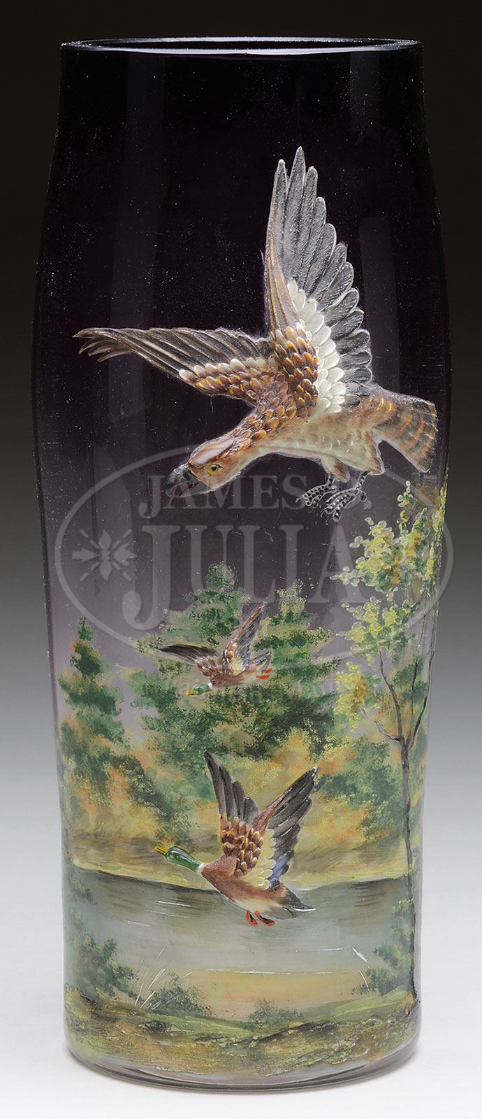 MOSER APPLIED & DECORATED VASE.Moser vase is clear shading to amethyst glass and is decorated with an applied 3-dimensional hawk flying above two applied 3-dimensional mallard ducks which are just getting ready to land in a pond. The pond and wooded shoreline are enameled in shades of green, yellow and brown. Backside of the vase is undecorated. Signed “Moser Karlsbad” on the underside. SIZE: 12″ t. CONDITION: There is a repair to the hawk’s beak and a microscopic flea bite to outside edge of rim; otherwise very good. 5-69387 (1,000-1,500) – Lot 2034