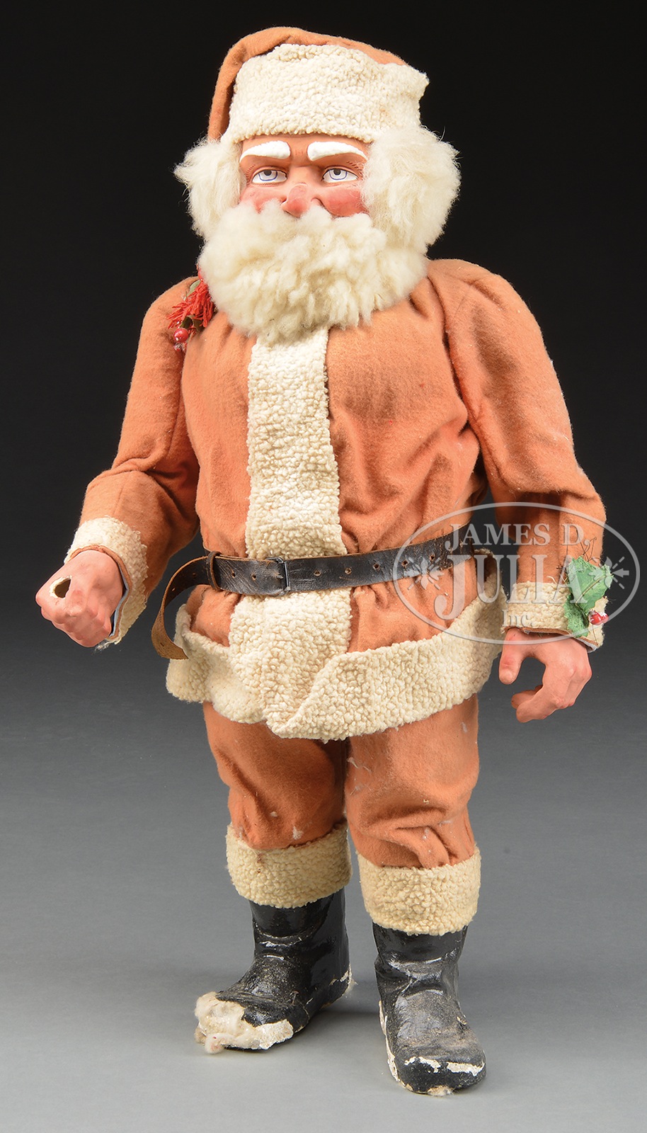 27″ RED COAT SANTA CANDY CONTAINER.An unusually large candy container of German origin, this jolly old fellow has a well-defined papier mache face with eyes looking upward and in is all original, as found, untouched condition. On his back he has a fabulous crepe paper sack with a few interesting items attached. However, he is missing his feather tree, which is often missing. The cardboard tubular candy container within is still intact and at some point in time was attached to a wooden base, showing traces of mica and white paint to the base of his boots. His beard and hair are original as is his red felt outfit that has faded somewhat with age and is lightly soiled. For display purposes, the previous owner constructed a large mat with a crepe paper chimney for a nice Christmas display. SIZE: 27″ h. CONDITION: As stated above. Papier mache face and hands are in exceptional condition with no paint touch up or repairs. 47929-1 (1,000-2,000) – Lot 2035 Auction: Advertising, Toy & Doll - Spring 2015 Please Note: All prices include the hammer price plus the buyer’s premium, which is paid by the buyer as part of the purchase price. The prices noted here after the auction are considered unofficial and do not become official until after the 46th day. |