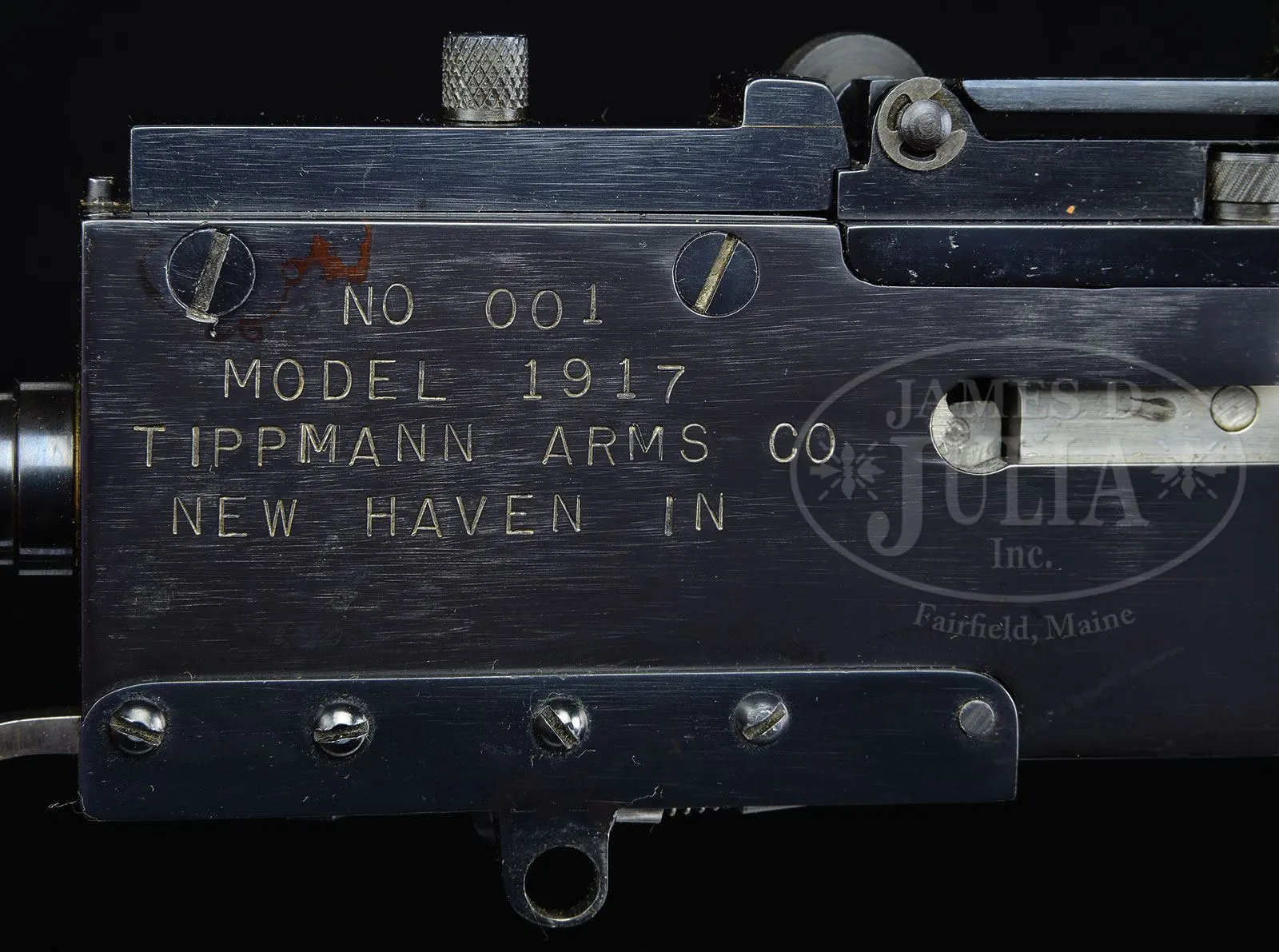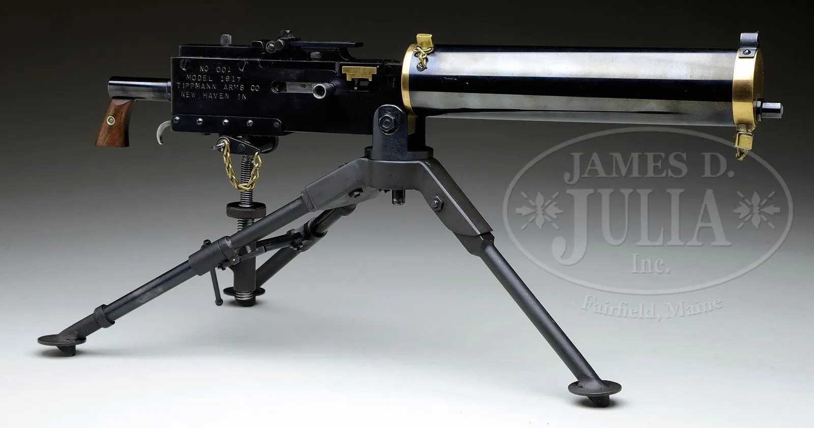 *TIPPMANN ARMS CO. MODEL 1917 MINIATURE SEMI-AUTO REPLICA OF BROWNING 1917 A1 WATER COOLED MACHINE GUN SN 001.SN 001. Cal. 22 LR, bbl 11″. This is the first SN’d gun of the semi-automatic Tippmann replicas of the Browning 1917A1 water cooled machine gun. This beautifully crafted firing replica includes brass and steel parts and includes a miniature tripod, traverse and elevation gear, 2 compartment wooden ammo box with belted ammunition and wooden crate made to hold this replica and its accessories. Firing mechanism functions smoothly when operated by hand. Traverse and elevation gear fits properly. This weapon appears fully functional as semi-auto only. CONDITION: Overall finish and appearance is simply outstanding with near 100% glossy blue finish on steel parts with attractive shiny brass nose cap, filler and drain plugs, rear trunnion and feed shuttle block. Wooden hand grips are of an attractive brown color with a brass escutcheon. Tripod likewise near excellent as is traverse and elevation mechanism. Internal parts show that the bolt has been back and forth and there is evidence that it has been fired. Bore is near excellent, shiny and bright. Bolt face is also excellent. It would be hard to imagine a more attractive little conversation piece in a den or office 4-54049 (4,000-8,000) – Lot 2036