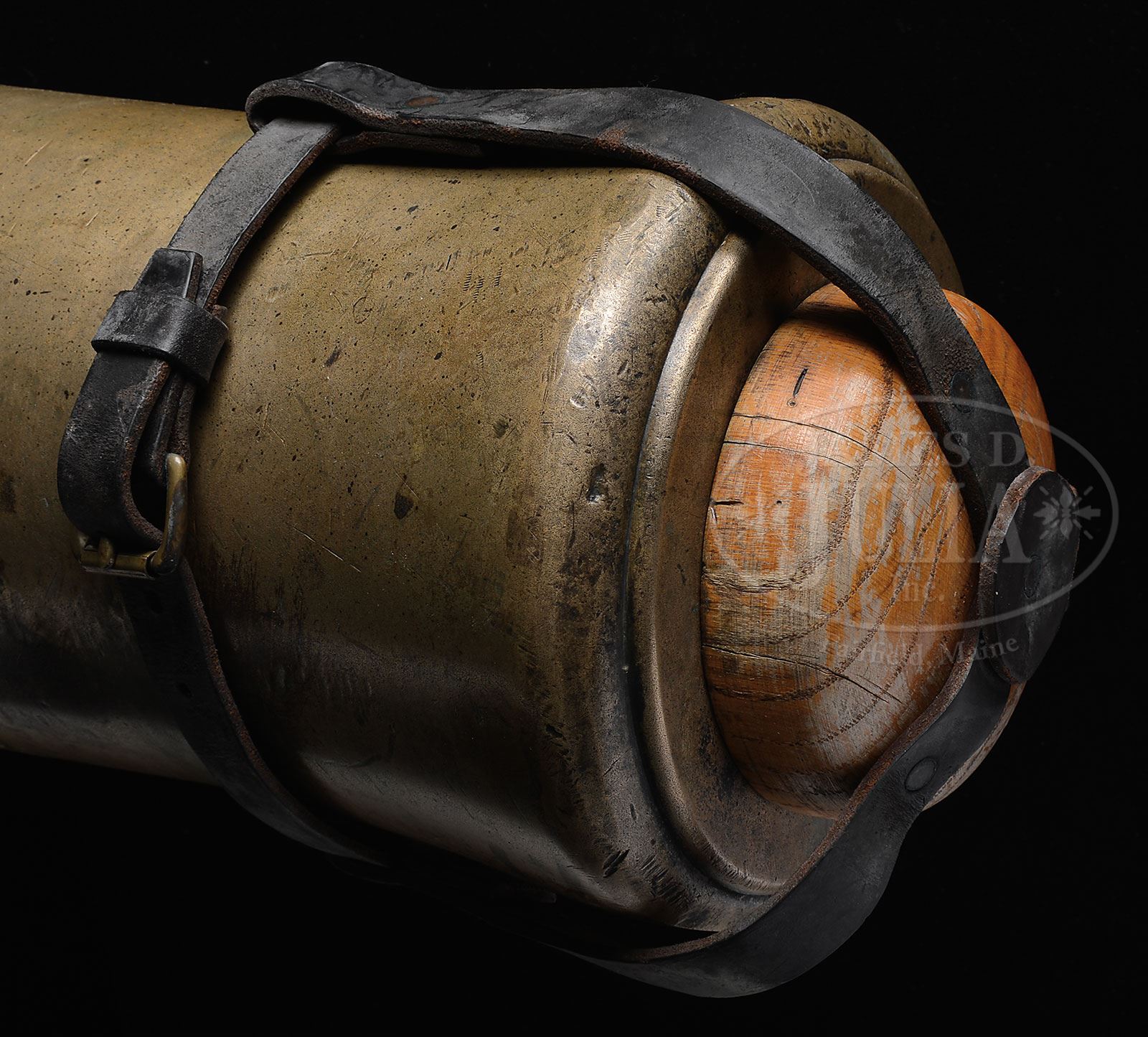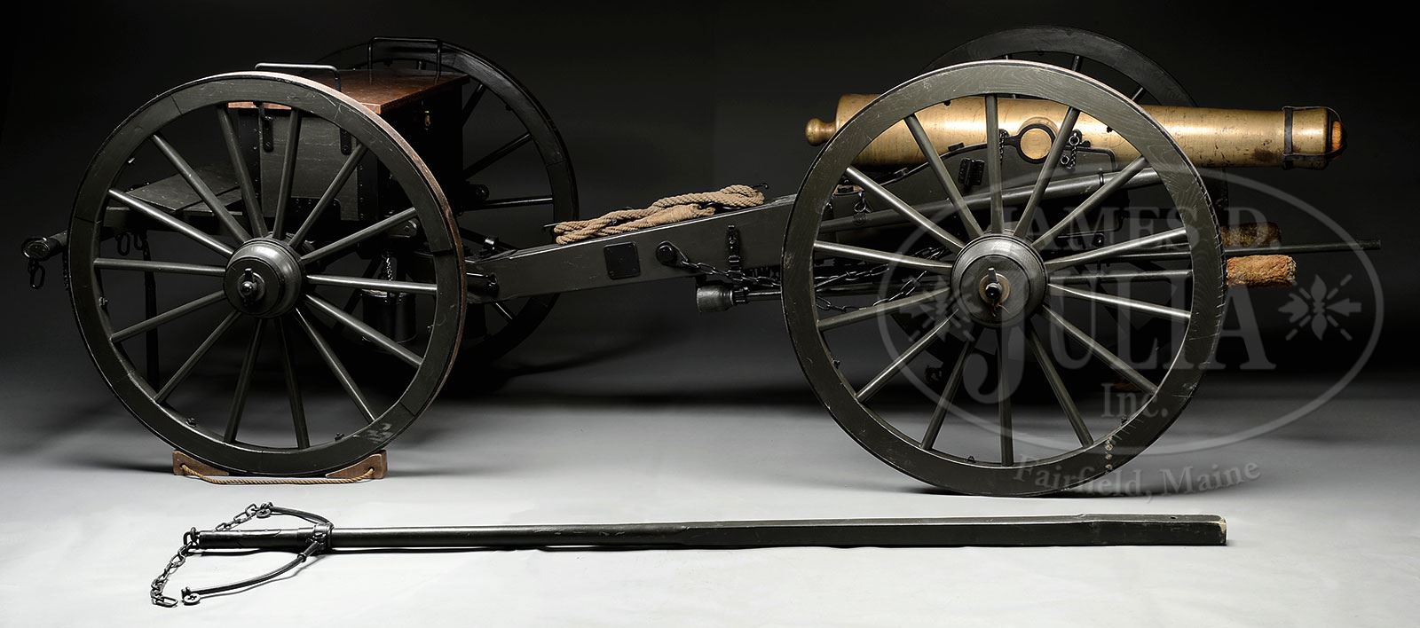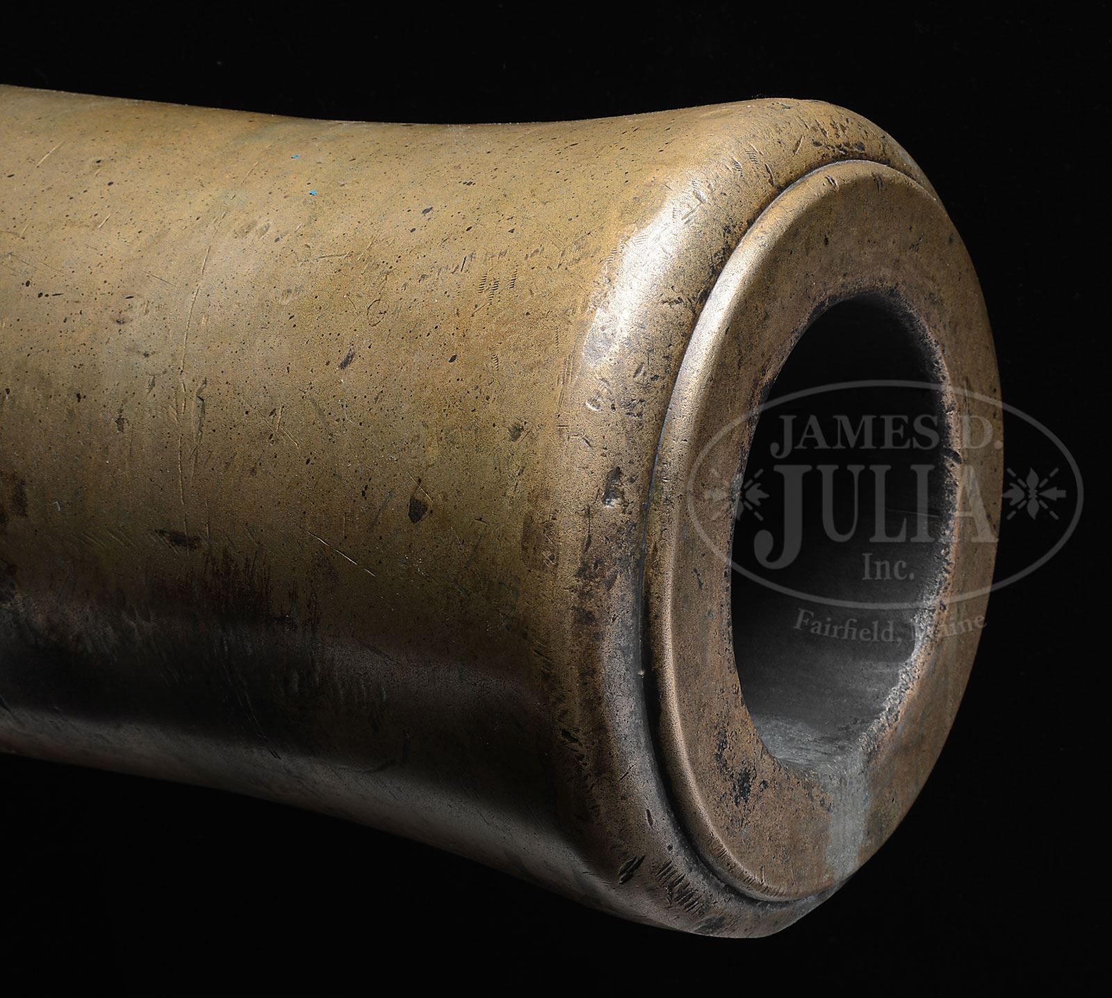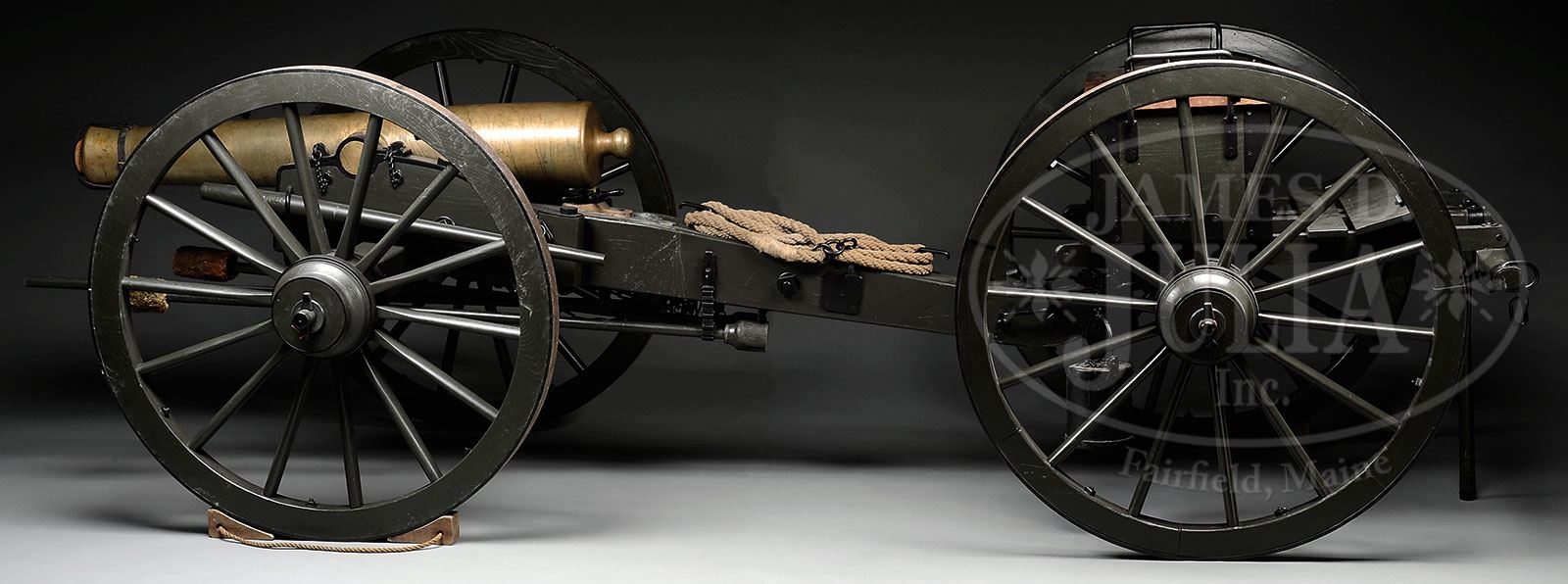 Please Note: We have just received some additional history on this cannon. It was NOT taken to New York, but was according to Wayne Stark’s 1984 Cannon Registry, donated to a GAR Post #134 in 1946 and was on display at the local GAR in Wood River, Nebraska until it eventually sold. It was also featured on a television series “Sons of Guns” on Discovery Channel in 2010. EXTREMELY RARE CONFEDERATE NEW ORLEANS MADE 12-POUND BRONZE NAPOLEON ON CARRIAGE WITH LIMBER.SN 30. This spectacular gun, just recently discovered, is the only privately owned New Orleans made Napoleon cannon. Bronze gun metal was not available to the foundries in New Orleans so a proclamation was sent out from Gen. P.G.T. Beauregard to the Southern States to send their bells to N.O. to help the war effort. This is no doubt one of the Napoleons cast by Leeds from bells sent to New Orleans from churches, plantations and such across the South. Records of Leeds & Co, New Orleans indicate they shipped two light 12 pdrs on the December 19, 1861…probably foundry #19 & 20; by February 19th they shipped four more #5,30,37,and 38. Robertson’s Alabama Battery had four Leeds Napoleons on Ruggles line at Shiloh in April of ’62 of which gun was most likely one. The Federals reported capturing six Leeds Napoleons after the battle of Missionary Ridge. It seems safe to say this gun was at Shiloh and quite possibly captured at Missionary Ridge. The other five known examples listed in Field Artillery Weapons of the Civil War by Hazlett, Olmstead & Parks, 2004 are all in museums or owned by National Park Service. Other listed existing SNs are 19, which is at the Petersburg National Battlefield Park; SN 38, at John Browning Museum, Rock Island. IL; SNs 45 & 53, on display at Augusta Arsenal Museum, GA; and SN 49, at Carlisle Barracks, PA. SN 30, which we offer here, is in beautiful condition with complete markings as on other examples: “1862” on left trunnion, “LEEDS & CO. NEW ORLEANS” on right trunnion. This cannon is mounted on an exacting #2 regulation field carriage with limber and implements. This cannon is ready to be taken into the field and get revenge on the Yankees who originally captured her and took her to New York. This is the only Confederate Napoleon to ever be offered at public auction and we can find only two Confederate 6-pound bronze tubes ever auctioned in the last 30 years. There are no more than 4 or 5 Confederate bronze Napoleons by any maker that are privately owned; this is your opportunity to get the most desirable bronze Confederate cannon extant. CONDITION: Very good as can be seen in photographs, as is carriage and limber. Markings are crisp and fine. 4-54465 (200,000-250,000) – Lot 2037