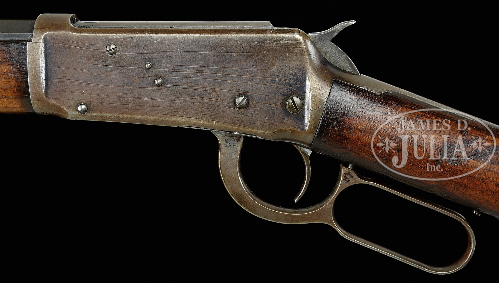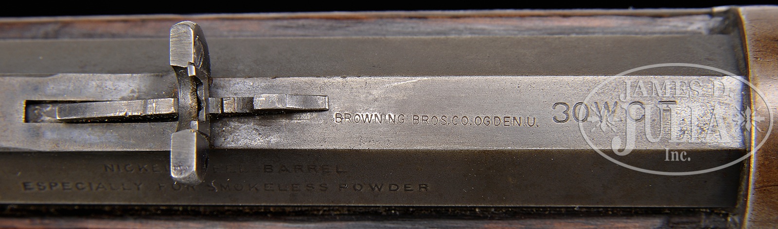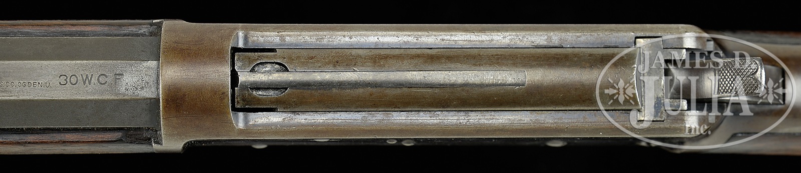 SCARCE BROWNING BROTHERS MARKED WINCHESTER MODEL 1894 LEVER ACTION RIFLE.SN 114102. Cal. 30 WCF (30-30). Standard grade rifle, 26″ oct bbl, full magazine, slightly thinned, half-nickel front sight with screw & altered semi-buckhorn rear sight with homemade elevator. Top flat of bbl, in the area between the rear sight and caliber marking has the tiny stamp “BROWNING BROS. CO. OGDEN. U”. Mounted with uncheckered, straight grain American walnut with straight stock & crescent buttplate. Accompanied by a Cody Firearms Museum letter which identifies this rifle in 30 Cal. with oct bbl, plain trigger & sporting rear sight, received in warehouse July 18, 1901 and shipped Aug 5, 1901 to order number 104942. This rifle is typical of a lot of Western used firearms that saw hard service on the frontier with limited or no maintenance. CONDITION: Fair to good. Bbl & magazine tube retain a smooth blue/brown patina with a couple of dings on the bbl and light edge wear. Receiver retains blue in sheltered areas being mostly a plummy/brown patina with striations on both sides. Buttstock has a crack in the toe with myriad nicks & dings and shows heavy wear with a cleaned, lightly sanded finish. Top tang has peen marks and an extra hole. Mechanics are fine. Strong dark bore that may clean better. 50186-5 JR209 (1,500-2,500) – Lot 2037 Click here to view provenance