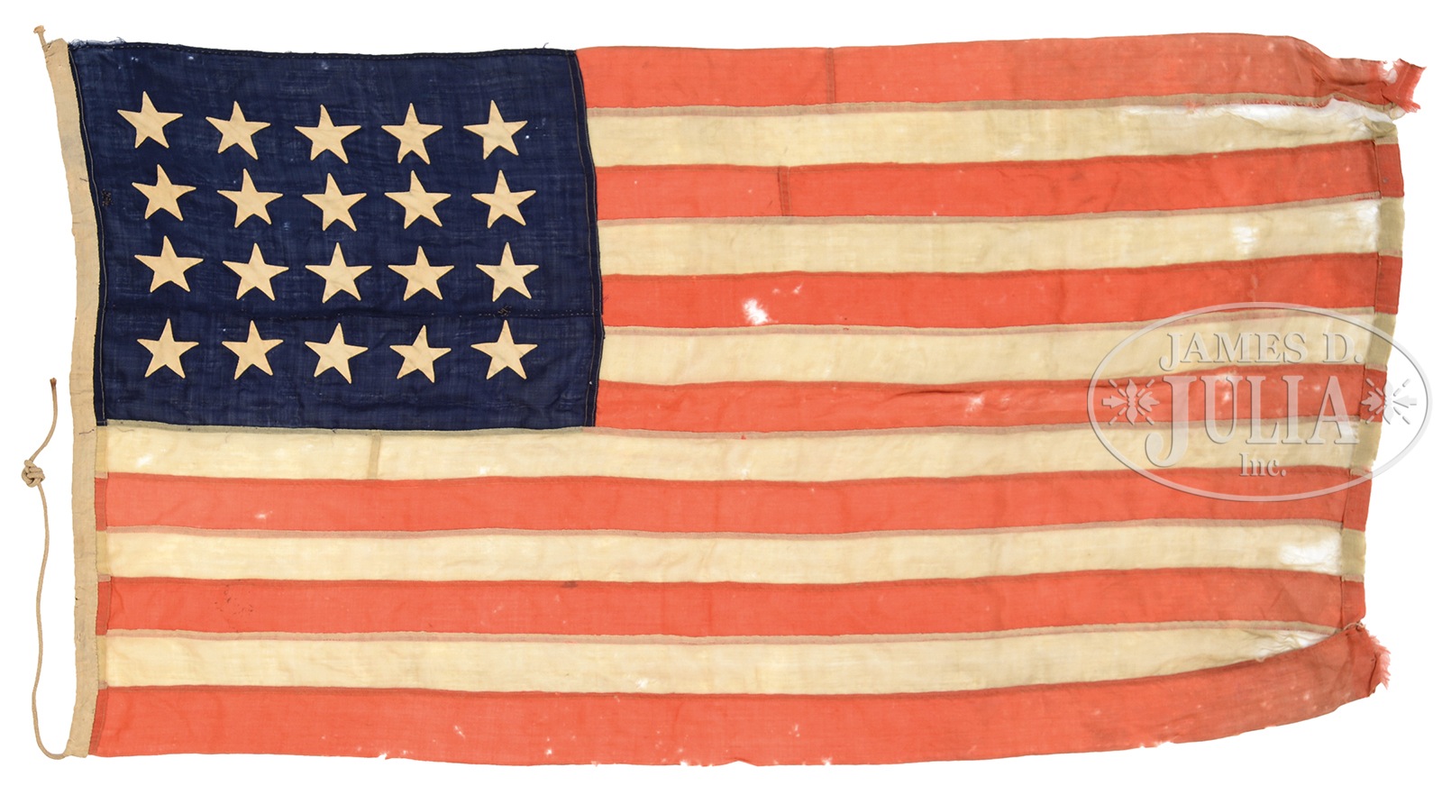 20 STAR AMERICAN FLAG COMMEMORATING MISSISSIPPI.Flag measures 40″ on hoist, 72″ on fly. 20 3-1/2″ hand sewn, double applique cotton stars are attached to single ply blue wool bunting canton in four rows of five. Red and white stripes are also single ply bunting, which are machine sewn. A 3″ folded over linen hoist contains a rope for attachment. Hoist is hand sewn to flag. 20 star American flags commemorate the addition of Mississippi as the 20th state in 1818. 20 star flags were only official for two years with the addition of Illinois as a state in 1819. This flag, however, does not date this early, but is later 19th Century as construction and materials are much more typical of the Civil War era and other odd configurations of stars are known on boat flags as this flag most likely was used, considering it’s rope hoist. Regardless, this is a fine 19th Century 20 star flag that is a great size for display and is a rare configuration. CONDITION: Very good overall. Blue color is bright. Red is somewhat faded. There are scattered areas of staining and small holes and contemporary repairs for continued use There is fraying on the fly end. There are several small holes, the largest being about an inch but they do not affect aesthetics. The canton was originally made from two hand sewn panels which most of the stitching has come loose. There is a more modern attempt to repair, though still separated for about 1/4 of its length. However, this could easily be re-sewn. 49938-1 (2,000-4,000) – Lot 2038