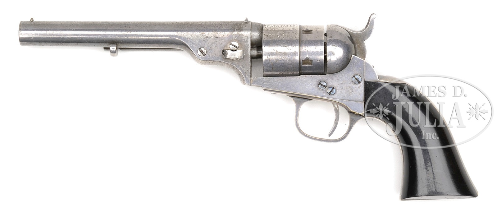 EXTRAORDINARY RARE COLT PROTOTYPE MODEL 1871-1872 POCKET SIZED CENTER FIRE REVOLVER.SN 8. Cal. 38 CF. Silver finish with 5-5/8″ rnd bbl, brass pin front sight and 1-line New-York U.S. American address. Breech end of the bbl has a tiny dovetailed V-notch sight just at the end of the address. Right side of bbl lug is mounted with a small ejector housing that has a very nicely checkered half-moon ejector rod head. Bbl is a new manufactured item, not a conversion from another model. Frame is completely unmarked except for SN. Cyl is rebated with 5-chambers like the pocket Navy and has stage coach holdup scene roll marking. Frame & cyl are also new manufactured items, not conversions, with solid recoil shield recessed about 1/4″ for the cyl star wheel. The hammer is an identical miniature of the later Single Action Army revolver with conical firing pin and a conical recess in the frame. Frame has a loading gate at the right side with external tension spring. Brass grip frame has a large trigger guard and contains a 1-pc smooth ebony grip matching numbered to this revolver. Serial number “8” was observed on the frame, trigger guard, buttstrap and cyl spindle. Rear face of the bbl lug, wedge, loading gate and right rear face of frame have the tiny number “7”. Cyl appears to be unnumbered, but may have had a tiny number on the face, which is now obscured by pitting. Left side of bbl lug and cyl have tiny British proofs. An article by Harry C. Konde that appeared in the September 1964 guns magazine discussed another of these revolvers, SN “1” which is pictured with ivory grip and a 62 Police bbl versus the orig bbl on this revolver. Another picture, however, later in the article shows a revolver similar to this one. Page 234, illustration B of The Book of Colt Firearms, Wilson, depicts 2 nearly identical revolvers, SN’s “1” & “2”. Caption reads “two of the limited group of arms believed made for testing the British and American market for this design of revolver”. Accompanying is a 2 pg letter by R.L. Wilson discussing this very revolver and its various features. He hypothesises that because of the British dislike of rimfire cartridges, Colt made up several of these revolvers that were hand carried to England for testing, probably in about 1872. Apparently nothing came of this test and this model was never placed into production. As of this writing it is still unknown how many of these revolvers were actually made, but, as Mr. Wilson speculated, probably no more than a dozen. From the available material it appears that only SN’s 1, 2 & 8 are known. PROVENANCE: The William Gerber Family Collection. CONDITION: Very fine, overall retains about 90% strong orig silver plating with some dulling on the front and back straps; cyl retains about 85-90% orig silver finish and shows 70-75% stage coach holdup scene roll marking; grip is sound showing some light wear with a very few light scratches and retains most of its orig finish. Mechanics are fine, bright shiny bore with a few scattered spots of moderate to heavy pitting. This is undoubtedly an extremely rare gun that requires additional research. (WG-046) 4-51069 JR516 (50,000-100,000) – Lot 2039
