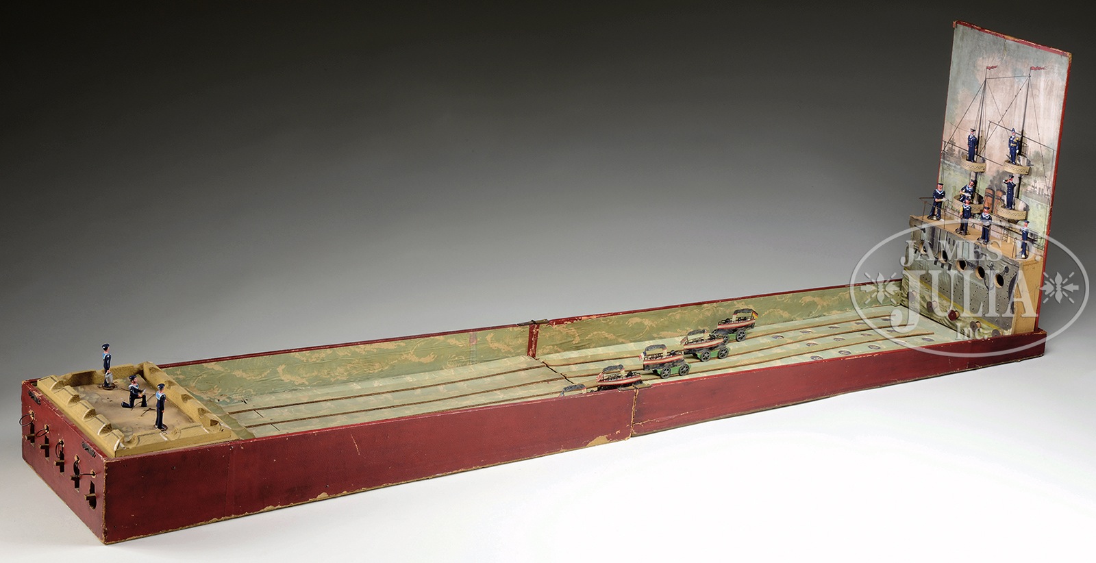 FRENCH MARBLE GAME.Outstanding paper litho on cardboard and wood game with paper label reading “Les Torpilleur Nouveau Jeu” (The New Destroyer Game) depicting a nautical battle scene on the box lid. Box unfolds to expose two part playing field decorated as a stylized ocean scene. On one side, a vertical battleship backdrop is inserted. The base features five tracks cut with various score holes for the marbles to land in, each lane containing a wheeled tin ship, each carrying a different country’s flag (France, Britain, U.S., etc.). For game play, there appear to be two parts. One of which marbles are ejected from one side, bound for their respective score holes. For the other part, a spring-loaded mechanism catapults the ships down their respective lanes, perhaps to see which goes the farthest. Opposing decks have been set with painted lead sailors for decoration. A wonderful crossover piece for collectors of games, seafaring military collectors, tin toys, and more. SIZE: 24″ l x 13″ w. when closed. Approximately 48″ l and 12-3/4″ h when open and assembled. CONDITION: Overall good to very good. There has been some settling of the box lid with the top label exhibiting some water staining and a few nibbles. Box itself has some chips to the finish. 45146-11 (1,500-2,000) – Lot 2039 Auction: Advertising, Toy & Doll - Spring 2015 Please Note: All prices include the hammer price plus the buyer’s premium, which is paid by the buyer as part of the purchase price. The prices noted here after the auction are considered unofficial and do not become official until after the 46th day. |