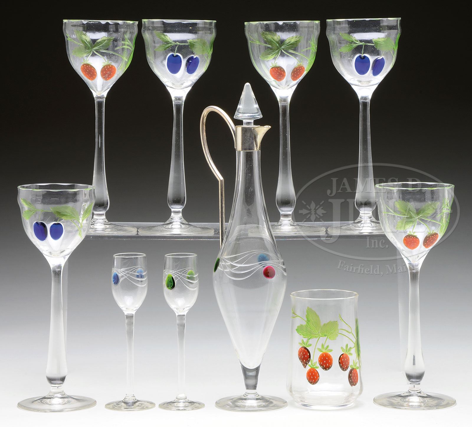 LOT OF MOSER MARQUETRY GLASSWARE.1) Three Moser wineglasses have blue Marquetry berries against a clear glass vertically ribbed cup on long slender stem. The berries are suspended from a cut glass branch and leaves with green staining. Unsigned. 2) Three Moser wines and one tumbler have Marquetry red strawberries on each of the vertically ribbed cups. Each of the wines have long slender stems and inverted saucer foot. Each piece has cut leaves and stems with green staining. Unsigned. 3) Moser Art Deco decanter and two cordials have inlaid Marquetry spheres of green and blue. The spheres are connected by 3 cut glass wavy lines and the decanter is finished with a nickel plated collar spout and handle. Decanter is finished with a clear glass cone shaped stopper. Unsigned. SIZE: 1) 7-3/4″ t. 2) Wines 7-3/4″ t, tumbler 3-7/8″ t. 3) Decanter 11-3/4″ t, cordials 5-1/2″ t. CONDITION: 1) Very good to excellent. 2) Very good to excellent. 3) Stopper has a chip to the bottom edge of the cone, base is uneven and wobbles. Cordials are very good to excellent. 5-69516 (1,200-1,500) – Lot 2040