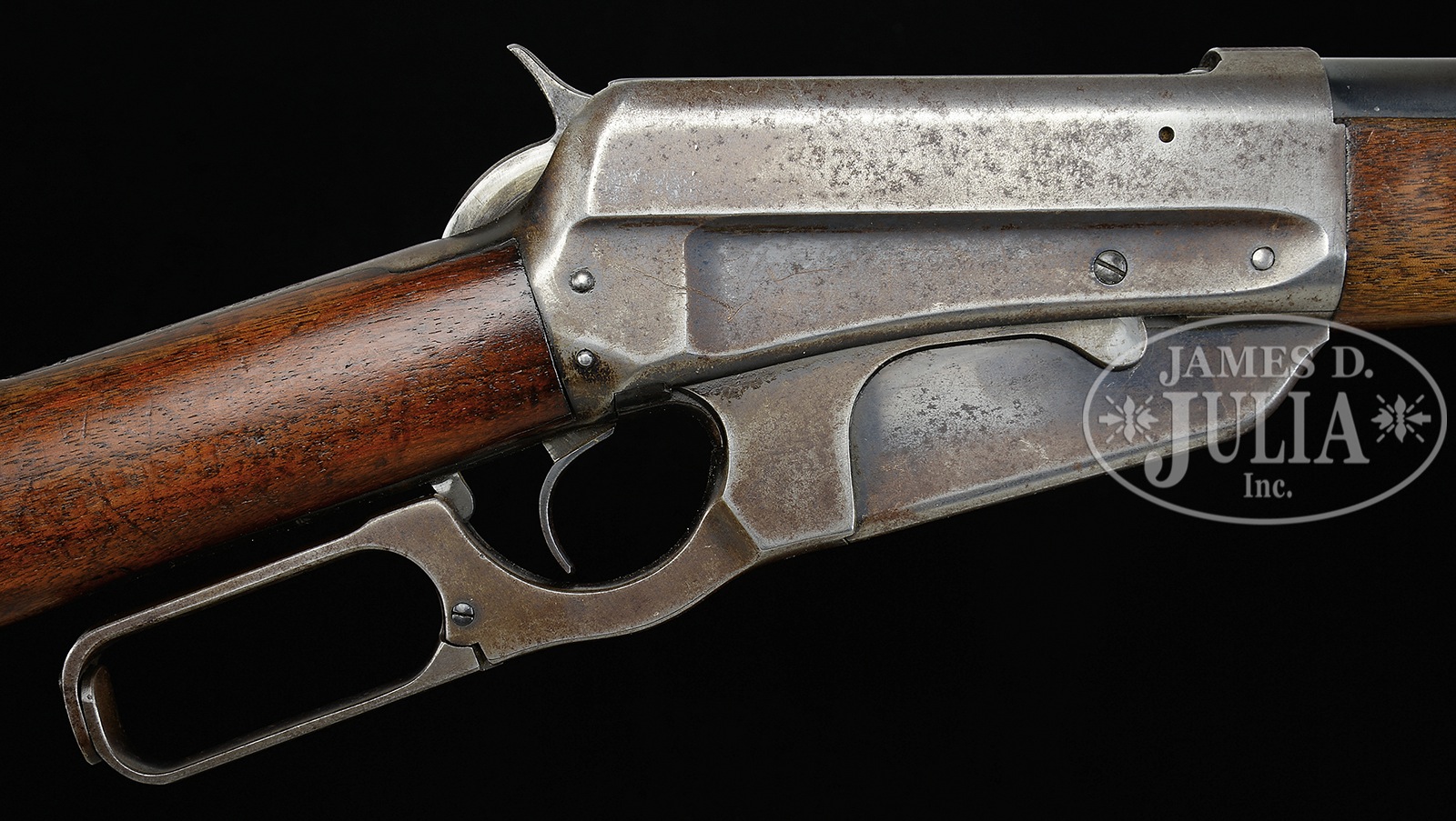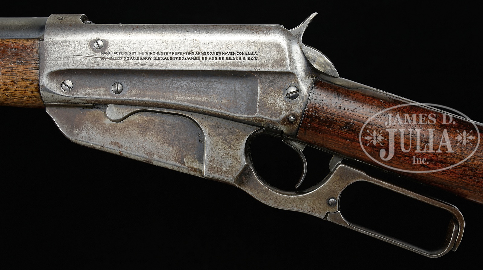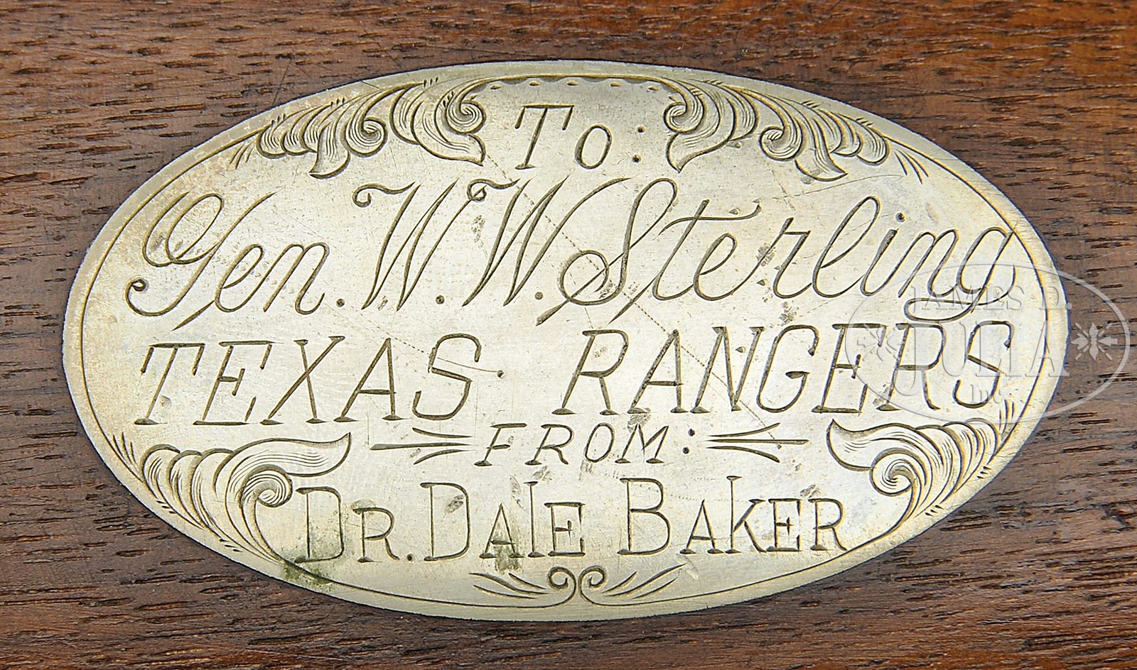 *RARE WINCHESTER MODEL 1895 LEVER ACTION RIFLE IDENTIFIED TO TEXAS RANGER W. W. STERLING.SN 420502. Cal. 30-06. Standard grade rifle with 24″ tapered rnd bbl, pedestal mounted front sight with screw & flat top rear sight. Mounted with uncheckered, straight grain American walnut with black insert, Schnable tip forearm & straight stock with crescent buttplate. Right side of buttstock has an oval 2-3/8″ x 1-3/8″ oval German silver plaque that is engraved in period script “To: / Gen. W.W.Sterling / TEXAS RANGERS / from: / DR. DALE BAKER”. William Warren Sterling (1891-1960) was a Texas born man. In 1901, his family moved to Beaumont and at age 17 he entered Texas A&M College. He worked on ranches in the region until 1915 when problems with Mexico erupted and he joined the Rangers and became a Scout for the 3rd U.S. Cavalry in Hidalgo & Cameron Counties. During WWI, he became a 2nd Lt. in the 9th Texas Infantry and after the war was Deputy Sheriff & Justice of the Peace in Mirando City. In 1927, he was appointed Capt. of Company D, Texas Rangers and was almost immediately sent to quell the lawlessness in the oil boom town of Borger. At about the same time, the famous sculptor Gutzon Borglum (famous for Mt. Rushmore) used Mr. Sterling as the model for his Texas Ranger statue. In 1931 he was appointed adjutant general (Commander) of the Texas Rangers and the Texas National Guard in which capacity he served until 1933 at which time he resigned and re-entered the Army. He served as a Colonel during WWII and was discharged in 1944. He later managed ranches in South Texas. Mr. Sterling authored a book Trails and Trials of a Texas Ranger in 1959. He died April 1960. Accompanied by a 3-pg letter from Winchester historian & author George Madis wherein he verifies the technical information about this rifle. Also accompanying is a collection card from the famous Charles Schriner III Collection of Mountain Home, TX (the YO Ranch) which states that he purchased this rifle from the Tom Kielman auction Dec 6, 1986. Also accompanied by letters of correspondence to and from Mr. Sterling. In addition, there is a copy of a letter from Mr. Sterling to Charles Schriner, III dated July 24, 1957 which addresses a firearm stating “it was good to hear from you, and to know that you have my old pistol. I was a pall bearer at my late comrades funeral and a few days ago I called on Mrs. Hamer in Austin. She did not know anything about the wooden handled six shooter”. Apparently, a reference to a revolver he had obtained from the very famous Ranger Frank Hamer. He also references his book which relates the history of that gun, from which he had cut away part of the trigger guard and altered it in other ways. Additionally accompanying is a volume of letters, papers & newspaper articles about Mr. Sterling. PROVENANCE: Tom Kielman Estate; Charles Schriner III Collection. CONDITION: About good. Bbl retains about 70% dull orig blue with a cleaned area of storage rust & fine pitting about mid-point on the left side. Receiver retains about 30% thin orig blue with the balance mottled silver/grey patina with some age spotting. Magazine box & lever are matching patina. Wood is sound with numerous nicks & dings, with traces of orig finish & shows a hand worn patina. Mechanics are fine. Strong dark bore. 50186-11 JR215 (10,000-15,000) – Lot 2040 Click here to view provenance