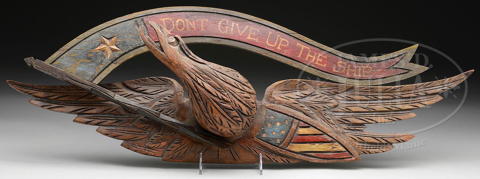 CARVED AND PAINTED EAGLE PLAQUE WITH BANNER. Late 19th century, New England. In the manner of a Bellamy eagle, the three dimensional carved and turned eagle’s head applied to carved wings and patriotic shield with attached star carved banner “DON’T GIVE UP THE SHIP” painted red, white and blue. The eagle, with crusty varnish surface. SIZE: 28″ L. CONDITION: Untouched original surfaces with minor age splits and with small loss to beak tip. Otherwise good. 9-91560 (1,000-1,500)