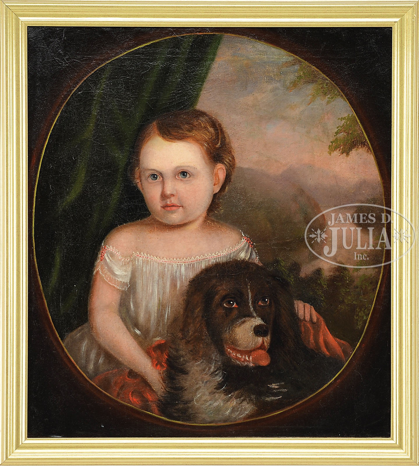 UNSIGNED (American, Mid 19th Century) PORTRAIT OF A CHILD WITH ROTTWEILER SHOWING VIEW OF THE HUDSON RIVER.Oil on canvas portrait shows young boy with white dress and his brown dog beside him. The portrait in oval form with brown shaded corners having a green drape on the left and a Hudson river landscape to the right. Housed in a modern gilt molded wood frame, unsigned SIZE: 25-1/4″ x 22-1/4″ Overall: 28″ x 25-1/4″ PROVENANCE: From a private New Jersey Collection; Doyle Auctions CONDITION: Craquelure, lined, scattered inpainting, otherwise very good 9-90623 (1,500-2,500) – Lot 2042