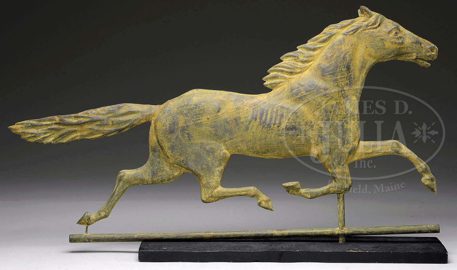 FULL BODIED COPPER RUNNING HORSE WEATHERVANE. Retaining traces of an early painted yellow surface. Possibly by Harris. SIZE: 31-1/2″ L x 17-1/2″ T. CONDITION: Very good, retaining an early worn yellow painted surface. 9-90657 (1,500-2,500)