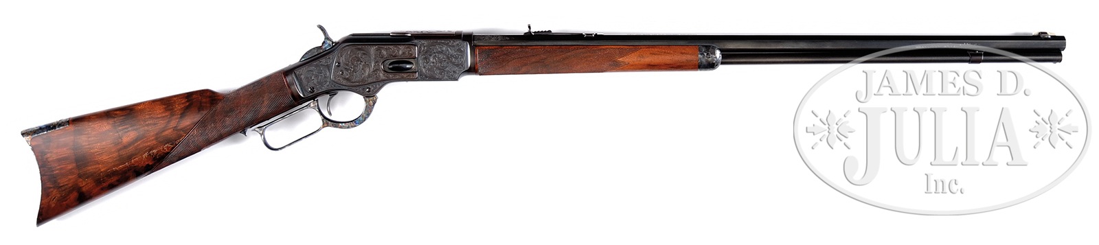 ENGRAVED MODEL 1873 OCTAGON BARREL RIFLE WITH SILVER INLAY.SN 381474B. Cal. 32WCF. 26″ bbl. Full magazine. Blue finish. Checkered American walnut stocks. Receiver and breech end of the bbl has been expertly engraved in a floral style with a silver bison inlaid into the left side plate. Stocks are highly figured with fine checkering on the forend and wrist. CONDITION: Fine as expertly refinished. Bbl and magazine tube retain 70-80% blue finish with the magazine turning silver gray. Bbl markings are sharp. Bore is frosty with strong rifling. Receiver retains 40% blue finish with the balance turning a plumb-brown. Hammer and lever retain 95% case colored finish. Stocks are very good with only a few handling marks and scratches, especially on the right side. Buttplate retains 95% case color finish. An attractive Model 73 custom rifle. 50469-3 TEP (2,500-4,000) – Lot 2044 Click here to view provenance