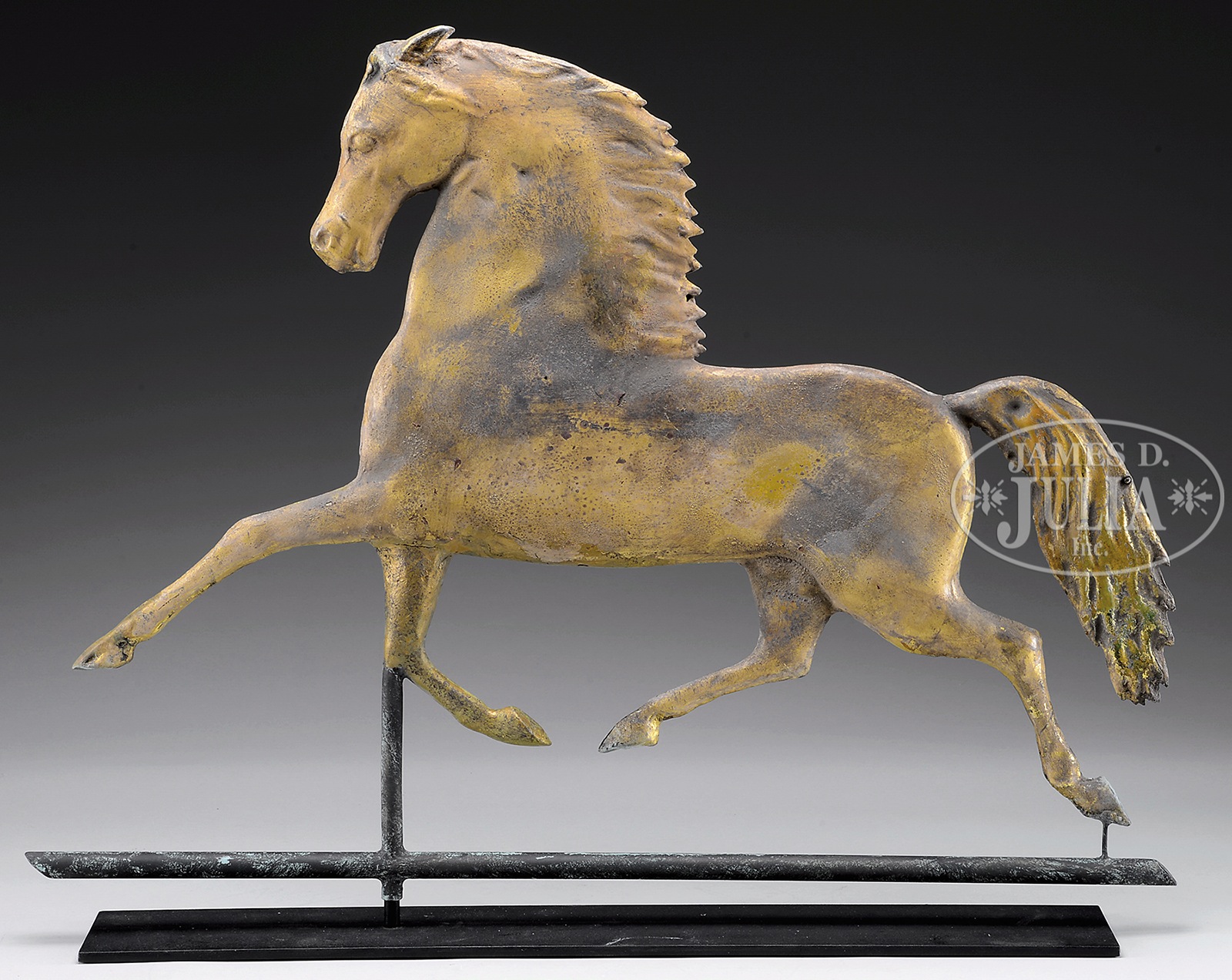 MOLDED COPPER “BLACKHAWK” HORSE WEATHERVANE ATTRIBUTED TO HARRIS.Molded copper trotting horse with flaring mane and tail. Cream and yellow painted surface. Attributed to Harris & Co., Boston, MA. Mounted on museum stand. SIZE: 17″ h x 26″ l. CONDITION: Very good with multi coats of paint. Some gilding showing through. Minor seam separation on one hoof. 9-94392 (2,000-3,000) – Lot 2046