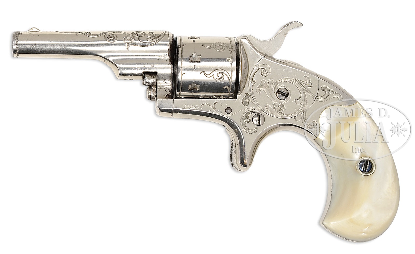 RARE ENGRAVED COLT OPEN TOP SMALL BORE SPUR TRIGGER REVOLVER.SN 45678. Cal. 22. Standard model with sloping hammer spur nickel finish with 2-3/8″ bbl, tiny front sight and 2-line Hartford address. Frame is open top style with “22 CAL” on left side below the cyl. Mounted with 2-pc birdhead smooth pearl grips that are matching numbered to this revolver. Cyl has 7 chambers with last 2 digits of matching SN on rear face. Although this little revolver was produced in large numbers very few were engraved and of those extremely few remain today with any orig finish. They were extremely popular with ladies & gentlemen who required a small, easily concealable short range revolver. PROVENANCE: The William Gerber Family Collection. CONDITION: Extremely fine plus, all matching including bbl, cyl & grips. Overall retains 99% plus orig nickel, appears to be unfired. Crisp mechanics, bright shiny bore with a couple small spots of pitting. (WG-036) 4-51078 JR366 (4,000-6,000) – Lot 2047
