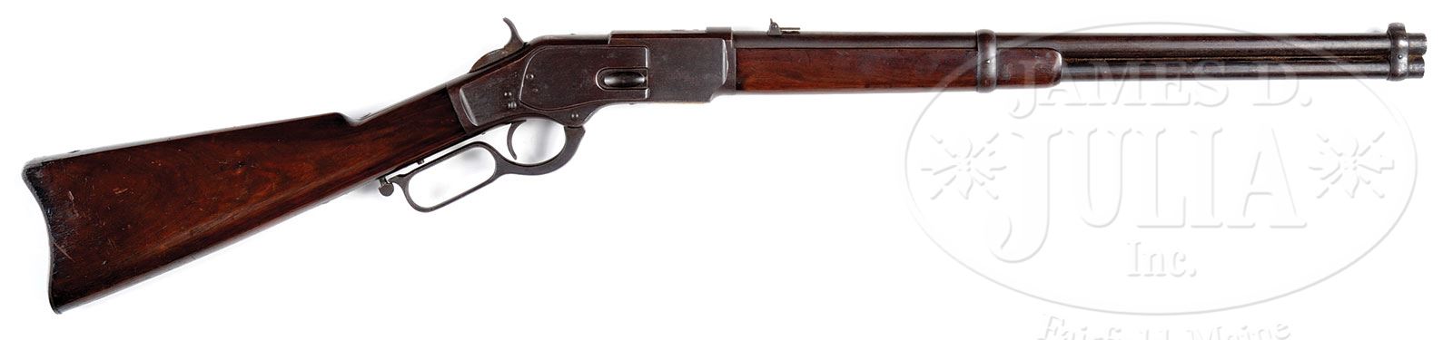 VERY RARE EARLY 1ST MODEL WINCHESTER MODEL 1873 SADDLE RING CARBINE.SN 1904. Cal. 44 WCF (44-40). Standard grade carbine with 20″ bbl, full magazine, integral front band/sight and 1866 style two position rear sight note two screws on frame above trigger. Note two screws on frame above trigger. Receiver is 1st type with mortised, impressed “round” thumbprint dust cover. Forearm band is thick Model 1866 style. Left side of receiver has a staple & ring. Mounted with uncheckered, slab-sawed American walnut with straight stock and carbine buttplate with trap that contains an orig 3-pc brass & iron cleaning rod. This was Winchesters first model for center fire cartridges and was wildly successful worldwide but primarily on the American frontier. These carbines were working tools usually exposed continuously to adverse conditions in saddle scabbards and wagon boxes. They are rarely found today with any orig finish. PROVENANCE: Collection of John Montague. CONDITION: Good. Bbl & magazine tube retain 20-30% orig blue in sheltered areas with the balance a dark brown patina and a cleaned area over the bbl address which is completely legible; receiver, lever & hammer are a dark crusty brown patina and the dust cover screw and block are missing. Stock has a chip by the heel otherwise wood is sound with nicks & scratches and retains a hand worn patina. Hammer will not come to full cock when the lever is operated although it functions well manually, otherwise mechanics are fine except dust cover as noted; strong bore with good shine and light pitting that may clean. Cleaning rod is fine. 4-54387 (6,000-8,000) – Lot 2048