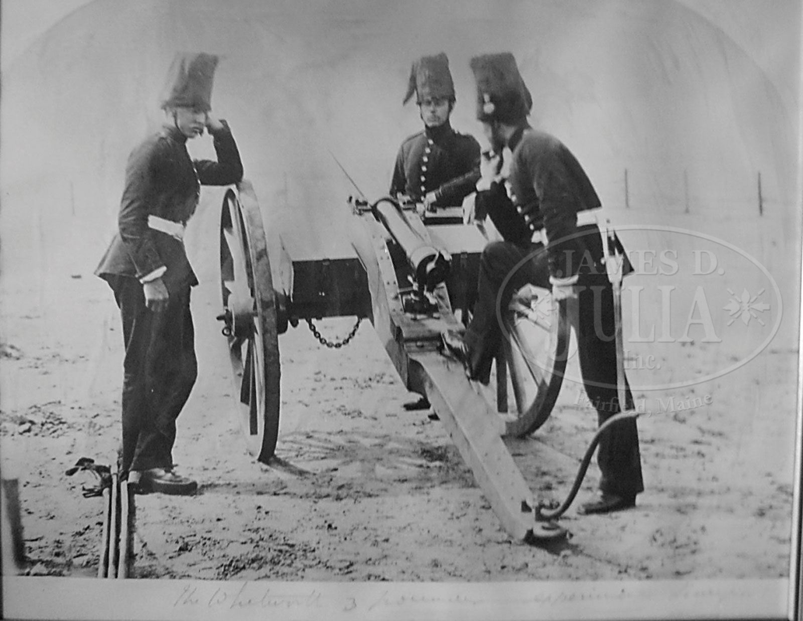 CIVIL WAR ERA RARE & UNIQUE 1.5 INCH WHITWORTH BREECH LOADING CANNON.SN NSN. This very rare Whitworth is seen in an 1860 Vintage photograph being test fired. The carriage accompanying this barrel was copied from the carriage seen in this photograph. This cannon was originally purchased in Thailand along with other obsolete weapons in the 1960’s. Whitworth, a prolific inventive genius, designed revolutionary breechloading and muzzle-loading rifles, cannons, and special projectiles for them to achieve greater accuracy than standard military arms of mid-19th century England. Various calibers of muzzle and breech loading cannons, based upon his extremely long range, phenomenally accurate hexagonally rifled system, were sold to the Confederacy and other countries. His introduction of new standards of accuracy in measurement and machining characterized his weapons, which were made to tolerances of a few ten-thousandths of an inch, unheard-of in the 1850’s. No other specimens of this exact gun are known. Whitworth identified his 1-1/2″ gun as a “3-pounder”. This contemporary description of testing is revealing: “In February last the Whitworth gun was tried on the sands at Southport, Lancashire…The 3-pounder, with an elevation of 35 degrees attained a maximum range of 9688 yards; at 20 degrees, 7073 yards; at 10 degrees, 4281 yards. ‘Nor was the accuracy less marvelous than the range-at 9580 yards the average lateral deviation was not quite 20 yards, at 9015 only 11 yards, at 6793 only 4 yards, at 1579 yards (not quite a mile) only 18 inches!…The charge for the 3-pounder is 8 ounces…The result of these experiments seems to be that the Whitworth exceeds the Armstrong in range, but does not equal it in accuracy. The Whitworth 3-pounder is 6 feet in length and weighs 208 lbs., with a bore of 1.5 inches” (The Annual Register, Or a view of the History and politics of the Year 1860, LONDON:PRINTED FOR J.& F.H. RIVINGTON; p.206. LITERATURE: The Artilleryman Magazine Spring, 1986. Cannon is accompanied by facsimile photograph of it being fired in test in 1860. This may be the only Whitworth piece of field artillery of the Civil War era to ever be offered. PROVENANCE: Springfield Arsenal, LLC Artillery Collection. CONDITION: Overall dimensions of gun are 82-1/2″, internal bbl length if 77″, overall length of bbl on carriage is about 10′ and overall width is about 58″. External metal pitted overall such that no marks are discernible. Bore & rifling in good condition. Breech threads in good condition such that breech can be screwed closed & opened easily. Carriage is well made, sound & solid. 4-54208 (40,000-60,000) – Lot 2048 Click here to view provenance