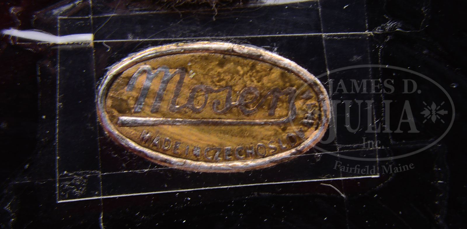 MOSER CAMEO GLASS VASE.Moser vase has dark red cameo glass decoration of grape vines, leaves and clusters surrounding the vase. The cameo decoration is set against a swirling yellow and white background with acid textured surface. The vase is signed on the center of one grape with etched signature “Moser” and also retains an original Moser paper label on the underside. SIZE: 10-1/4″ t. PROVENANCE: James Boma Collection. CONDITION: Very good to excellent. 5-69656 (800-1,200) – Lot 2049