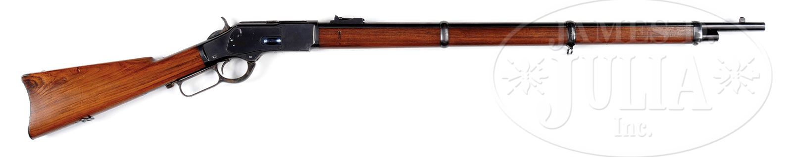 *WINCHESTER THIRD MODEL 1873 LEVER ACTION MUSKET.SN 570072B. Cal. 44 WCF (44-40). Fine musket with 30″ bbl, full magazine, square base front sight/bayonet lug & 900 yd musket ladder rear sight. Mounted with very nicely figured, uncheckered straight grain American walnut with full length forearm & straight stock and carbine/musket buttplate with trap containing a 5-pc all iron cleaning rod. Forearm is secured with 3 bands with the center band having a sling loop & a corresponding loop in the buttstock. Most of these 1873 muskets were sold to South American countries to arm their militaries which apparently never happened. Many of these muskets were returned to the United States in the mid-20th century still in their orig shipping crates & factory grease. Most of them are still in pristine new condition such as this one, usually with a few small bruises from the extended shipping. PROVENANCE: Woody Frey Collection. CONDITION: Extremely fine plus, appears to be new and unfired with only a small scrape on the right side plate & a few minor, tiny nicks. Lever, hammer & buttplate all retain brilliant case colors. Stock has 3-4 old bruises with another on the forearm. Wood is sound and retains virtually all of it’s crisp, orig oil finish. Even the lever latch retains all of it’s bright case colors. Mechanics are crisp. Brilliant shiny bore, appears to be new and unfired. Cleaning rod is equally new. 4-51944 (5,000-8,000) – Lot 2049