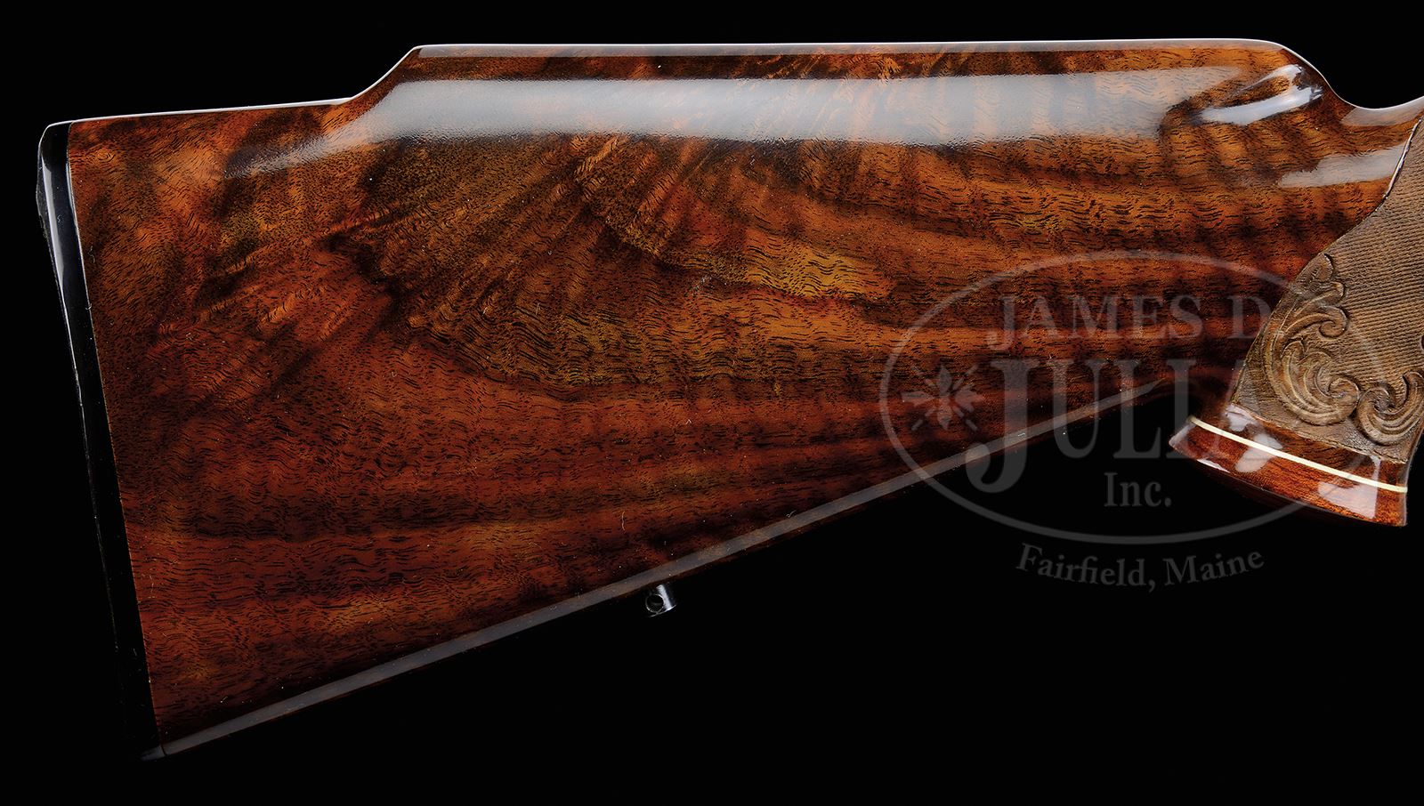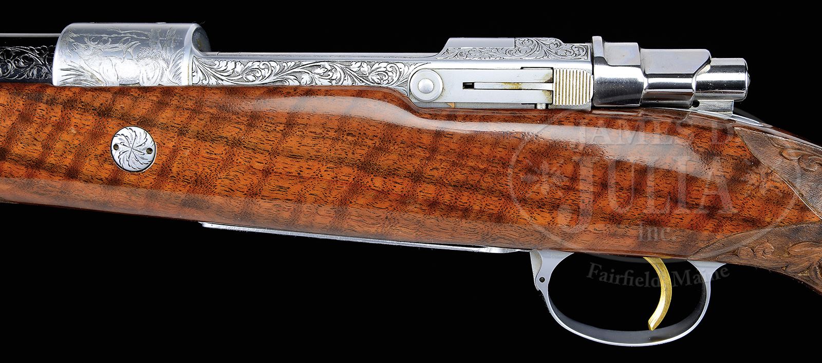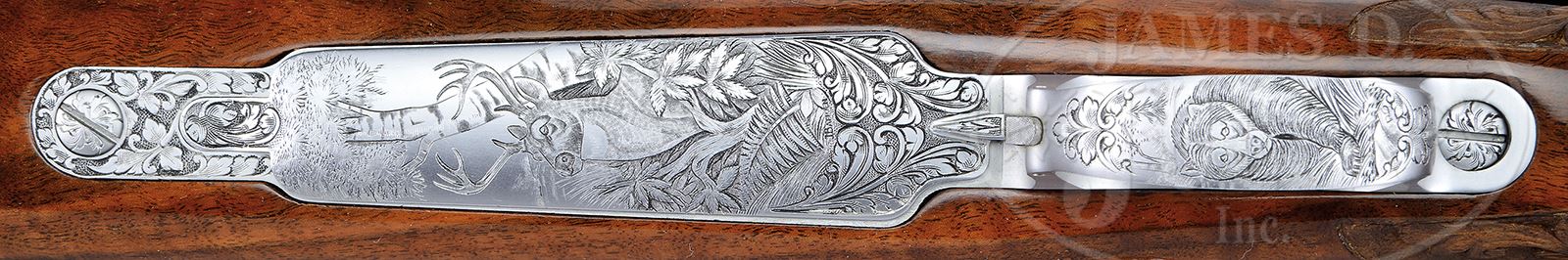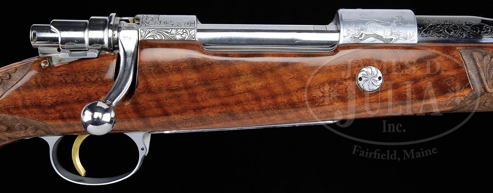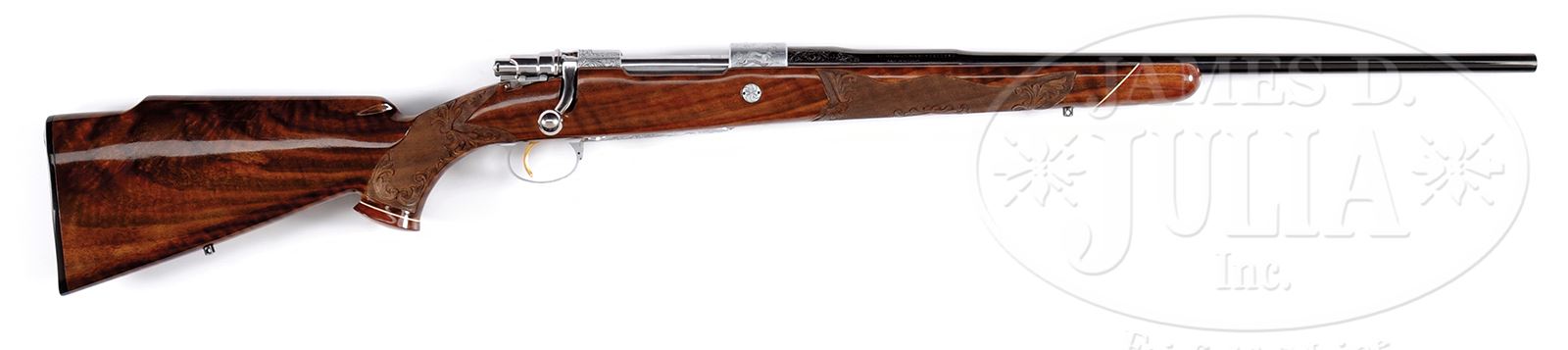 *EXCEPTIONAL .264 WIN MAG FN BROWNING HIGH POWER OLYMPIAN GRADE MEDIUM GAME RIFLE ENGRAVED BY BAERTEN, LEGIERS, AND R. GRECO WITH SPECTACULAR WOOD AND CASE.SN 1X11531. Cal. .264 Win Mag. 22″ Lightweight round bbl is marked with Browning Arms Co with St. Louis and Montreal addresses on left, and with caliber, SN and “MADE IN BELGIUM” on right side. There are 2″ triangles of scrolled acanthus engraving at sides of breech end. Coin finished Mauser action has gold-plated trigger. Action is engraved with well cut, shaded, acanthus scroll, as background to game scenes appropriate to caliber; a bugling elk is on left side of receiver ring, and a running pronghorn is on right. Floorplate depicts a portrait of a mule deer buck peering through branches with large birch tree in background, and a portrait of an approaching grizzly bear is on trigger guard bow. Bugling elk is unsigned. Pronghorn is signed “Legiers” where covered by wood. Bear is signed with initials “RG” (Reno Greco). Mule deer is signed “J. Baerten”. Wonderful, flame figured and full length fiddle figured nicely banded claro walnut gloss finished rosewood capped pistol grip stock is fitted with composition Browning buttplate. Stock features Monte Carlo comb with swept right hand cheekpiece, single recoil bolt, and rosewood forend tip with white line spacer. Matching flared grip cap has inset gold diamond on bottom. Closely spaced checkering at grip and forend is flanked by relief carved scrolling acanthus with stipple shaded background. Sling studs are in forend and on toe line. Weight: 7 lbs. 9 oz. LOP: 13-3/4″. Tan vinyl Browning case is lined in faun faux fur, and contains a key. PROVENANCE: Rod Fuller Estate Collection. CONDITION: Excellent, near new, with little evidence of having been fired, retaining essentially all its finishes on wood and metal, with only the lightest of handling marks. Checkering and carving have lightly darkened. Gold is excellent with a few light marks. There are slight operating marks on bolt. Wood tests negative for salt. Bore is excellent. Mechanically crisp. Case is excellent on exterior, fur is excellent. Some of the brown canvas is detaching from lid. 49114-68 MGM111 (6,500-9,500) – Lot 2049