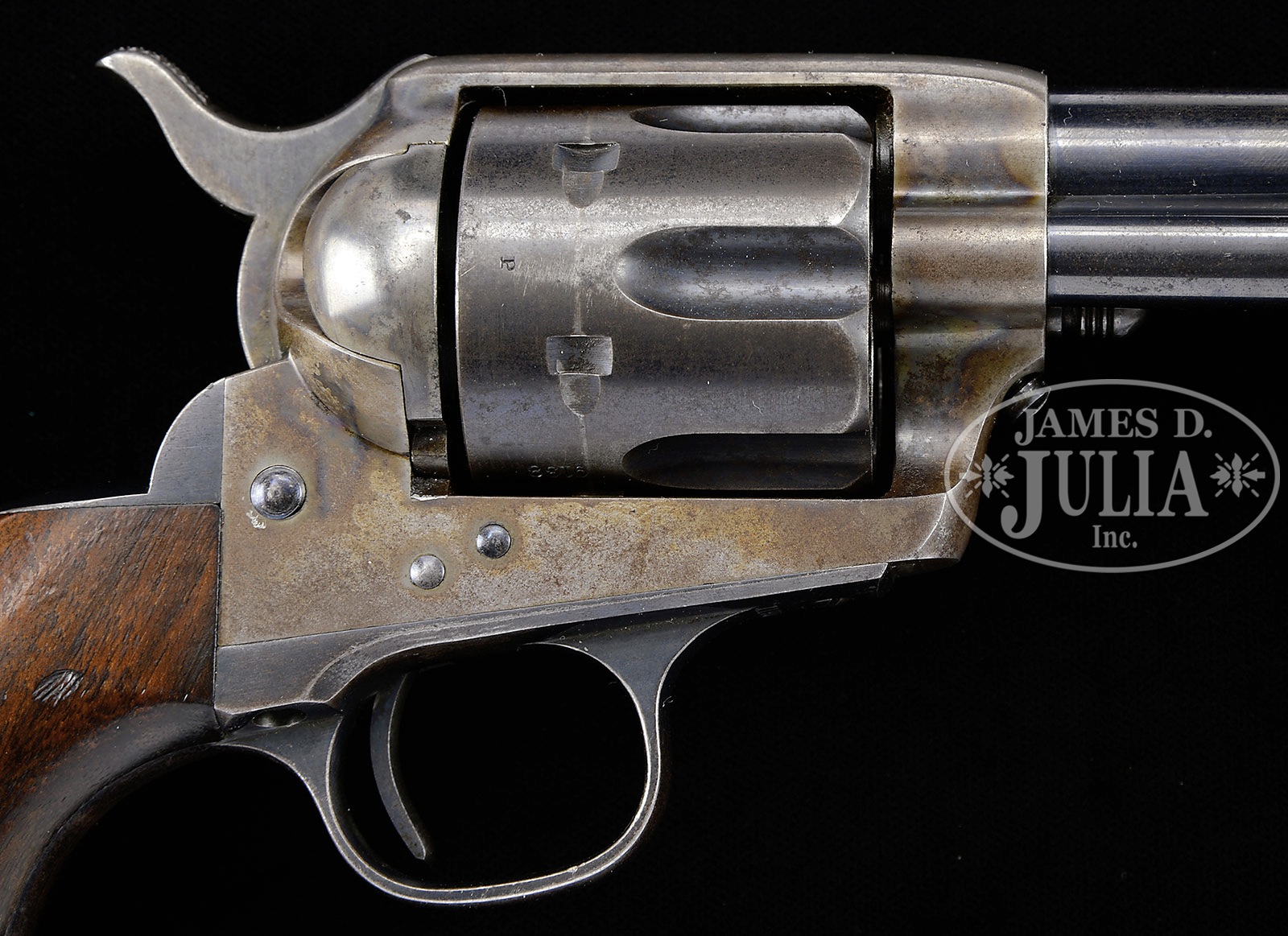 SN 119138. Cal. 45 Colt. Blue and color case hardened with 7-1/2″ bbl, full front sight and 1-line block letter address. Bottom of bbl, under the ejector housing hast last 4 digits of matching SN, which is also found on the cyl. Left side of frame has 3-line patent dates and a small “U.S”. Mounted with 1-pc walnut grip with last 4-digits of matching SN in backstrap channel. Left side of grip has the inspector initials “JGB” (Capt. John G. Butler) under the date “1887” and the right side a “DFC” (David F. Clark) sub-inspector initials. The “DFC” sub-inspector initials also appear on bottom of bbl, frame, cyl, and bottom left edge of grip. This revolver was part of the 11th contract for 2,000 guns, completed by March 1887. Capt. Butler’s inspectors cartouche is the only one known without a border. The fact that this revolver remains in a completely orig configuration shows that it probably remained with a Militia unit during the recalls of the 1890s and the early 20th century, where several thousand Cavalry Colts were recalled, had their bbls reduced to 5-1/2″ and were refurbished before being issued as artillery revolvers. PROVENANCE: The William Gerber Family Collection. CONDITION: Very fine, all matching including bbl, cyl & grip. Bbl retains about 85% glossy orig blue, showing holster wear and some minor flaking. Orig “feathers” are visible on both sides of the front sight and ejector housing stud. Frame retains case colors in sheltered areas having mostly lost its red and blue hues. Hammer retains bright case colors on the sides and rear edge turned dark on top. Trigger guard and backstrap retain bright blue in most areas, being a blue/brown patina on the front and back straps. Cylinder retains bright blue in the flutes with thin blue, turning brown on the outer diameter. Screws are all fine and retain most of their orig fire blue. Grip is sound with some minor battering on the bottom edges, shows light wear and retains about 90% orig finish. Mechanics are crisp, bright shiny bore with some very fine pitting. (WG-043) 4-51081 JR353 (20,000-30,000) – Lot 2050