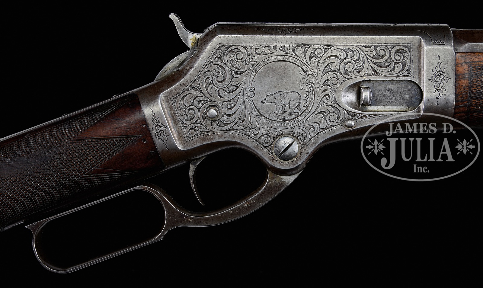 VERY RARE DELUXE ENGRAVED MARLIN MODEL 1881 LEVER ACTION RIFLE.SN 10352. Cal. 40-60. A previous consignor states that this rifle was owned & used by Floyd Marriott, a vigilante in the California gold fields in the 1880’s and 1890’s. He stated that Marriott was known to not have worn a hood during his vigilante activities and was later exiled to a foreign country in his old age, similar to what was done for Granville Stewart of Montana, also a famous vigilante. Model 1881 rifles are scarce to start out with, deluxe rifles are even more scarce and an engraved deluxe with extra length heavy bbl is most scarce. This fine rifle has an additional feature of the very rare 30″ extra heavy bbl with magazine tube 2″ shorter than the bbl, from the factory. It has a modified Lyman hunting front sight, missing the ivory bead and a Winchester “1876” marked ladder rear sight. Mounted with very highly figured, early style checkered European walnut with straight stock & semi-crescent, smooth steel buttplate. Receiver is very nicely engraved, by Conrad Ulrich with the vignette of a running elk on left side, a grizzly bear on right side and a tiny elk head on the top of bolt. Vignettes are all surrounded by very well executed foliate arabesque patterns with shaded background. This rifle will letter in caliber 40-60 with 30″ oct bbl, shipped March 31, 1885. CONDITION: About fine. No orig finish remains being a light gray/brown patina over all metal surfaces with scattered spots of light surface discoloration. Engraving is sharp & clear with good, fine detail remaining. Stock has a chip out of comb with a long scratch over the forearm with other light to moderate nicks & scratches showing moderate to heavy wear. Forearm is a smooth, hand worn patina while the buttstock retains 75-80% orig varnish. Mechanics are crisp, strong bright bore with some frosting in grooves. 49450-22 (8,000-10,000) – Lot 2050
