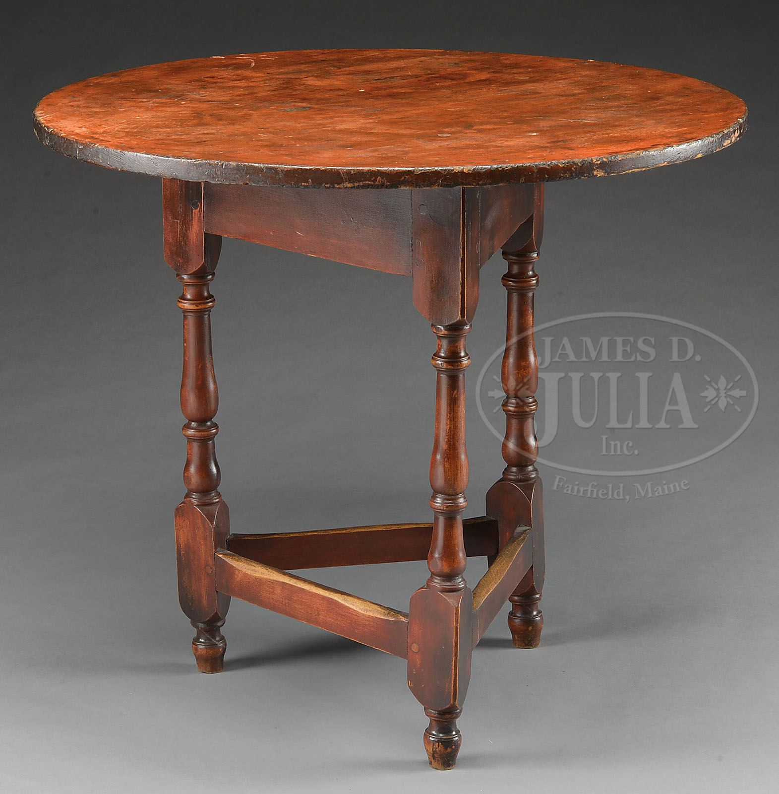 ROUND-TOP STRETCHER BASE TAVERN TABLE. Tavern table with turned legs separated by three stretchers with round top. Appears to be constructed of old & later parts now decorated in red stain. SIZE: 30-1/2″ dia x 27-1/2″ h. PROVENANCE: From a fine Kentucky Estate. CONDITION: Very good. 9-92219 (800-1,200)