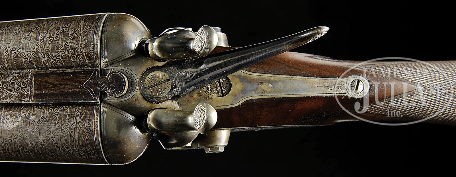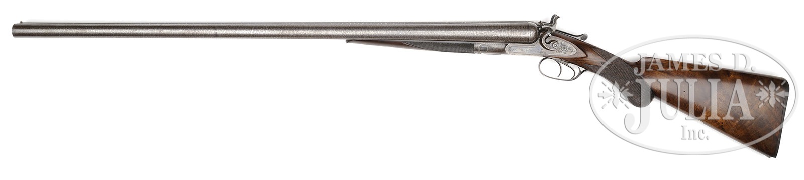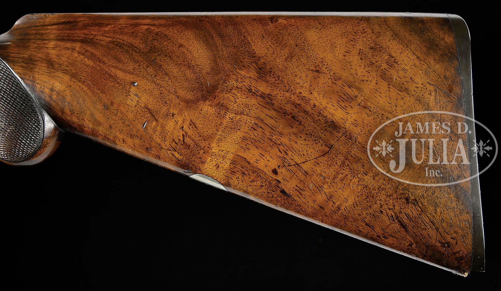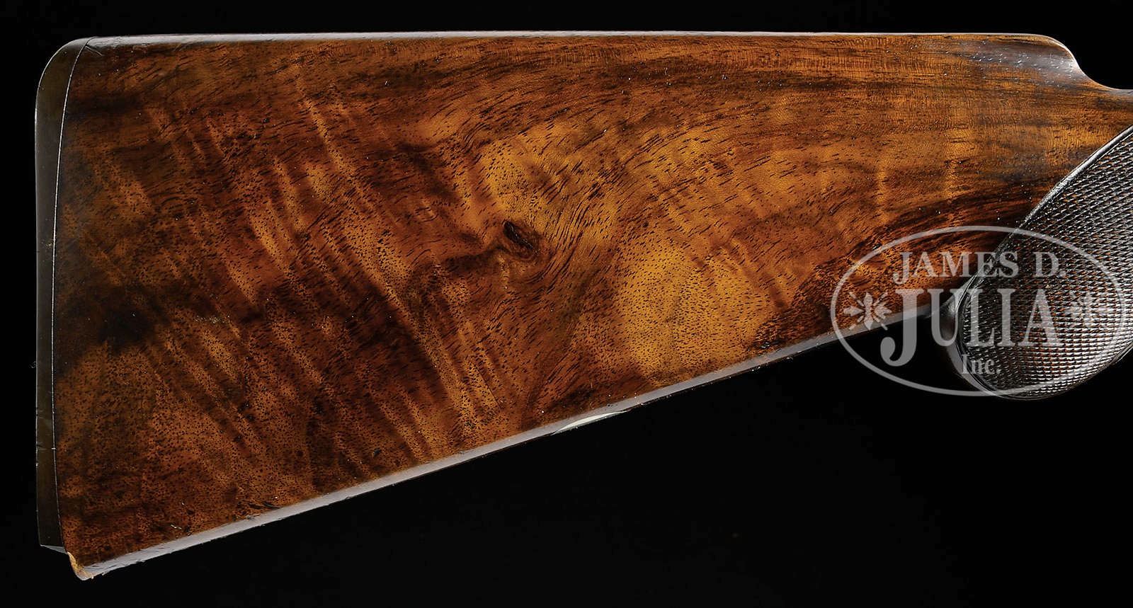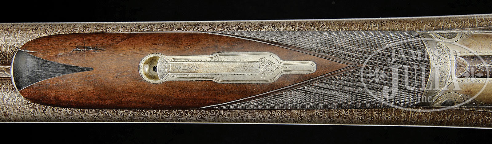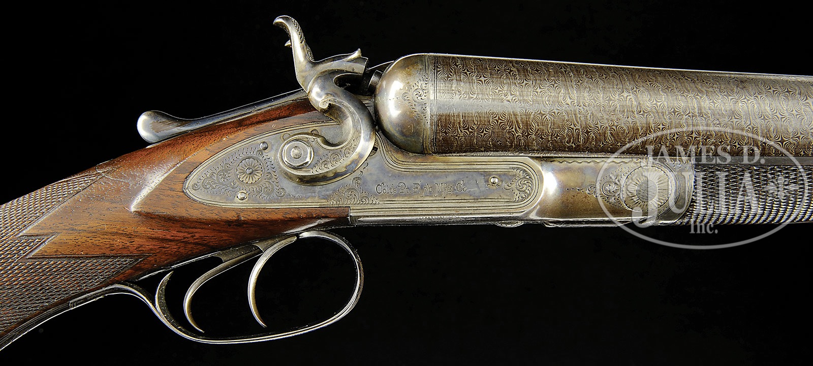 HIGH ORIGINAL CONDITION COLT 1878 HAMMER GUN.SN 18191. Cal. 10 ga. 2-7/8″ Chambers. 32″ Fine Damascus bbls are marked “COLT’S PT. F. A. MFG. CO. HARTFORD, CT. U.S.A.” on concave rib with unusual doll’s head extension (per factory letter). Case hardened top lever action is fitted with front action sidelocks that have serpentine high spurred rebounding hammers. Action is engraved with line borders and sprays of unusual broad bodied scroll. Lockplates are marked “Colt’s Pt. F. A. Mfg. Co.” Top lever, trigger plate and trigger guard are charcoal blued. Trigger guard has scroll on bow and SN at grip. Nicely figured and lightly marbled European walnut round knob pistol grip buttstock measures 14-1/4″ over checkered hard rubber buttplate with rampant Colt logo. There is point pattern checkering with mullered borders at grip, and a vacant silver oval on toe line. Matching splinter forend has inset ebony tip and Deeley type release. The doll’s head extension, engraving, and fancy wood were furnished at a cost of an additional $85.00 (per factory letter). Bore diameter: left-.790, right -.785. Bore restrictions: left -.020 (Mod), right -.018 (Mod). Minimum wall thickness: left -.048, right -.048. Drop at heel: 3-1/2″, drop at comb: 2-3/16″. Weight: 9 lbs. 15 oz. LOP: 14-1/4″. PROVENANCE: Factory letter confirming configuration and stating that gun was shipped Oct. 8, 1890. CONDITION: Excellent. Bbls retain over 90% brilliant orig Damascus finish, silvering lightly overall, and with a few areas showing cleaning over some pinprick pitting. Action retains approx 80% orig case hardening color, silvered on fences, and on bottom, which has considerable browning. Lockplates and hammers retain nearly all of their orig vibrant case color. Top lever is silvered at thumbpiece. Trigger plate is excellent, with some scratches. Trigger guard retains a considerable amount of its blue, most loss due to flaking. Stocks have a number of minor marks, bumps, and scratches in their orig oil finish. A 3/8″ x 5/8″ chip is missing from toe of buttplate, with some damage to wood. Bores are excellent with some light frosting. Action is tight. Locks are crisp. A very fine ’78 Colt, most saw exceptionally hard use. 4-51118 MGM261 (10,000-15,000) – Lot 2054