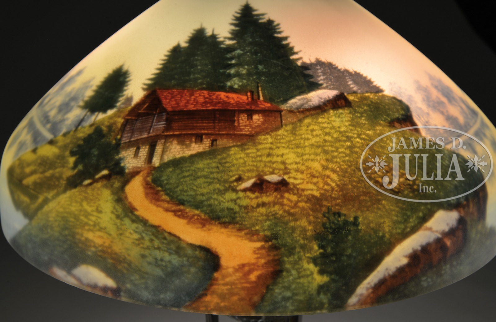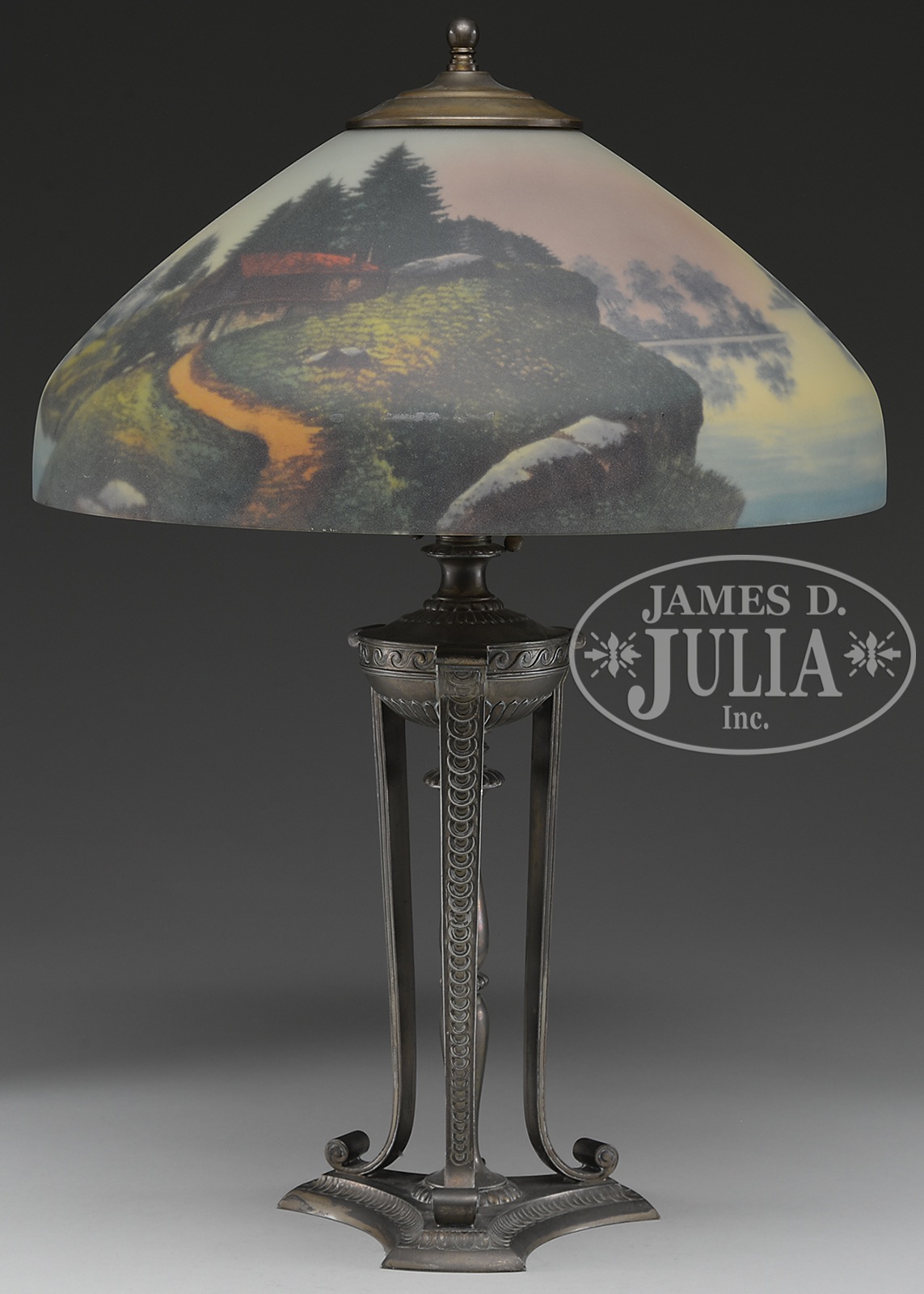 REVERSE PAINTED TABLE LAMP.Reverse painted Phoenix shade has country home sitting on the banks of a lake. The pattern repeats itself on front and back. The shade rests on a Pairpoint base with three legs supporting a center column and resting on a curved three prong platform. Base is signed on the underside “Pairpoint” along with the Pairpoint logo “D3070”. SIZE: Shade is 15-3/4″ dia. Lamp is 23″ t. CONDITION: Shade has minor roughness to aperture. Base has wear to finish. 5-67699 (500-700) – Lot 2054
