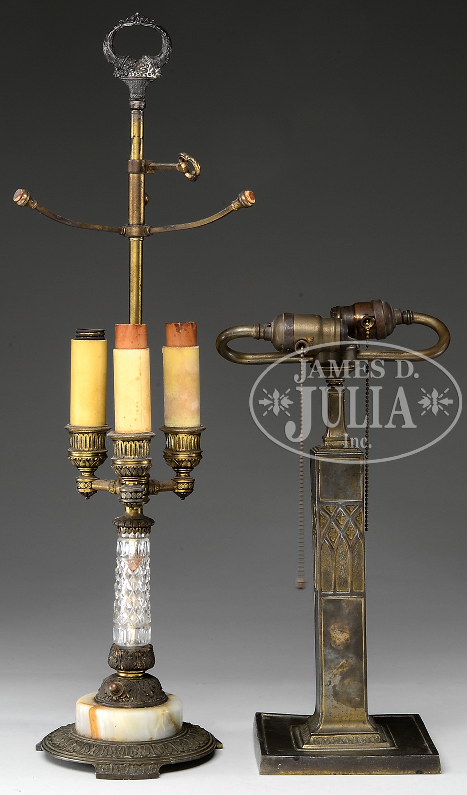 TWO PAIRPOINT LAMP BASES.1) Pairpoint square lamp base has square stem with arched design surrounding the stem leading to a two-socket cluster. Base has a brass finish and is signed on the underside “Pairpoint Mfg. Co.” along with the Pairpoint logo and “B3000”. 2) Has cast metal foot with acanthus leaf design leading to an onyx platform topped with cast metal acanthus leaf design holding a pressed clear glass stem which leads to a cast metal three-socket cluster. Base is completed with an adjustable height three arm shade support with cork ends. Signed on the underside “Pairpoint E3030”. SIZE: 1) 16-3/4″ t. 2) 27″ t. CONDITION: 1) One socket is loose from arm, finish is worn, and foot is bowed. 2) Very good with wear to finish. 5-67991 (300-500) – Lot 2055