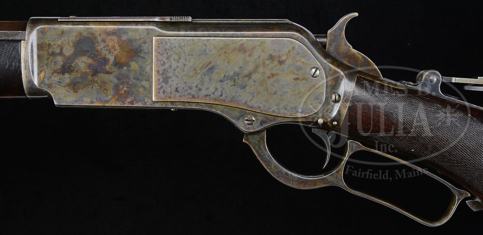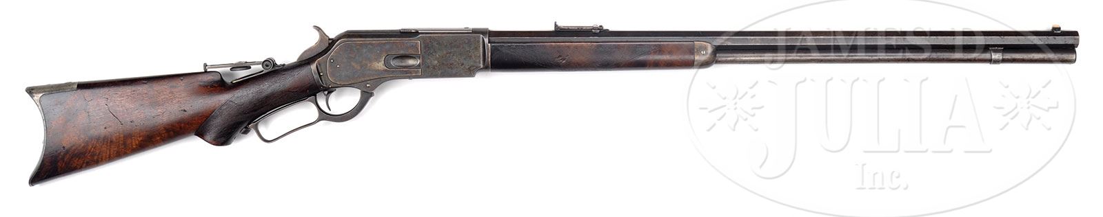 SCARCE DELUXE WINCHESTER MODEL 1876 LEVER ACTION RIFLE.SN 35135. 45-75 Cal. Fine deluxe rifle with 28″ oct bbl, full magazine, German silver bladed fixed front sight, 2-position adjustable ladder sight and added 3-1/4″ Vernier tang sight. Receiver is third type with machined dust cover rail and plain dust cover. Frame is case hardened. Mounted with very highly figured XX flame grain American walnut with checkered forearm and black insert, pistol grip buttstock that has crescent buttplate with trap containing a 4-pc brass & steel cleaning rod. Left side of lower tang is marked “XX” and with the assembly number “1710″ & “R” which number is also found in top tang channel of buttstock. Accompanied by a Cody Firearms Museum SN research request which identifies this rifle with oct bbl, set trigger, checkered stock with pistol grip, received in warehouse September 22, 1883 and shipped that same day. Research letter states Cal. as 76 which undoubtedly refers to the orig caliber of the other three guns in this shipment, the same notation, Cal is 45-75. PROVENANCE: Henry Bitz, Box Elder, MT. Lewis Yearout 1963. Estate Collection of Lewis & Leyton Yearout. CONDITION: Fine, all matching. Bbl & magazine tube retain about 20-30% orig blue balance plum/gray with staining. Magazine tube has several large scratches including about a 3″ zigzaged scratch about 6″ from muzzle though only partially seen as it is on section next to bbl. Frame, sideplates, hammer and nosecap retain about 80% muted case colors; lever retains about 50% muted case colors. Dust cover retains about 70% mixed blue, plum and brown finish with edges gray. Base of rear sight retains some orig color with pitting; tang sight retains 30-40% finish to base and leaf; buttplate is a silver/gray overall with areas of pitting. Stocks are sound, solid and well fit; diamond point checkering is heavily worn with several large dings and dents and typical other small scratches and blemishes typically seen. Stocks retain about 40% thin varnish overall, less on forestock. Mechanically gun is functional with well discerned rifling in pitted bore. 4-53822 JS103 (5,000-8,000) – Lot 2056 Click here to view provenance