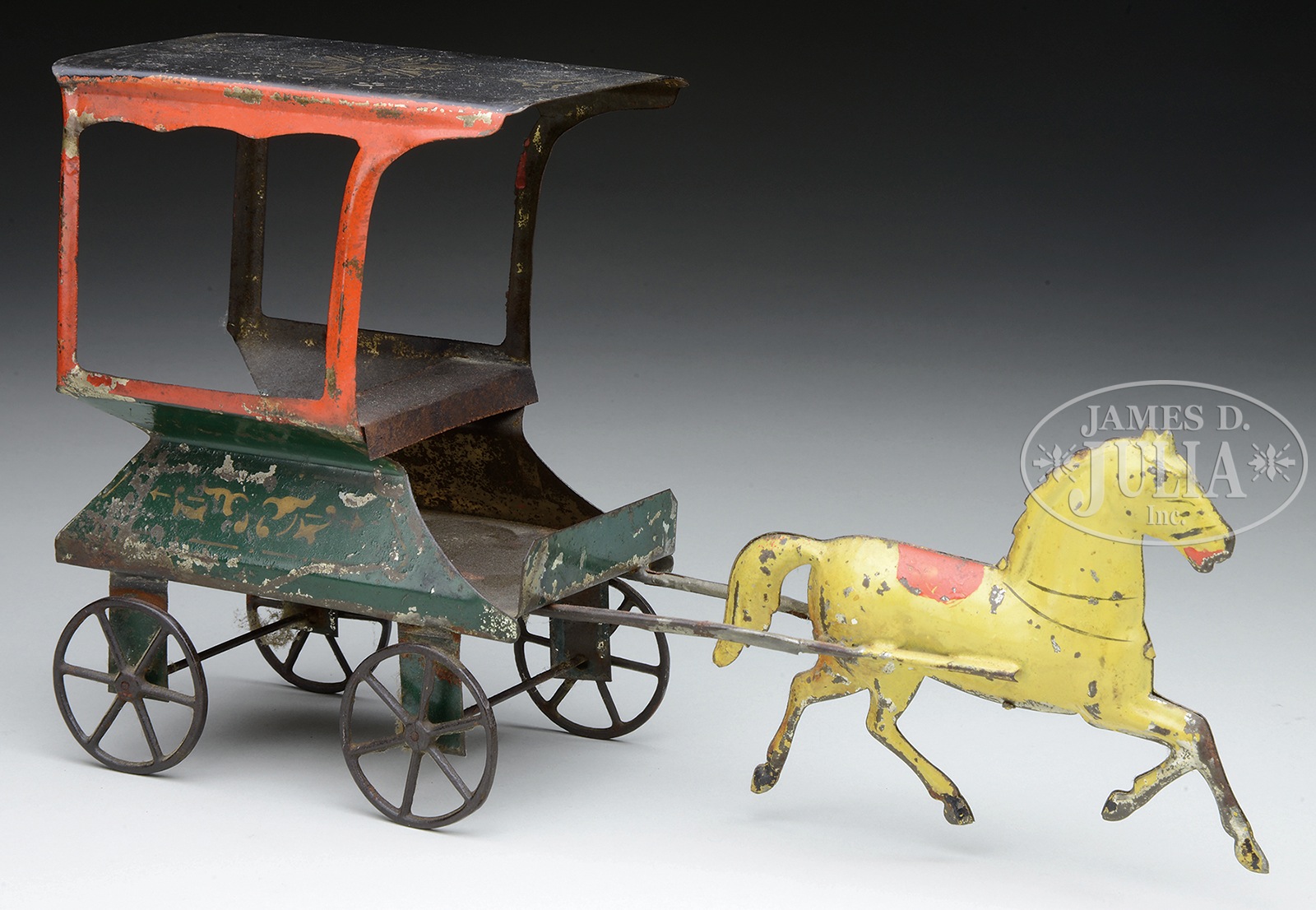 EARLY AMERICAN FALLOWS HORSE DRAWN WAGON.All tin late 1800s toy shows hand-painted horse pulling wagon of unusual configuration. Original stencil decoration to sides and top of red and green “cutout” design wagon. Cast wheels. SIZE: 12″ l. CONDITION: Toy is all original retaining filigree gold stenciling. Good overall. Interior of wagon was never painted and has dark oxidation. 48379-3 (1,750-2,250) – Lot 2056 Auction: Advertising, Toy & Doll - Spring 2015 Please Note: All prices include the hammer price plus the buyer’s premium, which is paid by the buyer as part of the purchase price. The prices noted here after the auction are considered unofficial and do not become official until after the 46th day. |