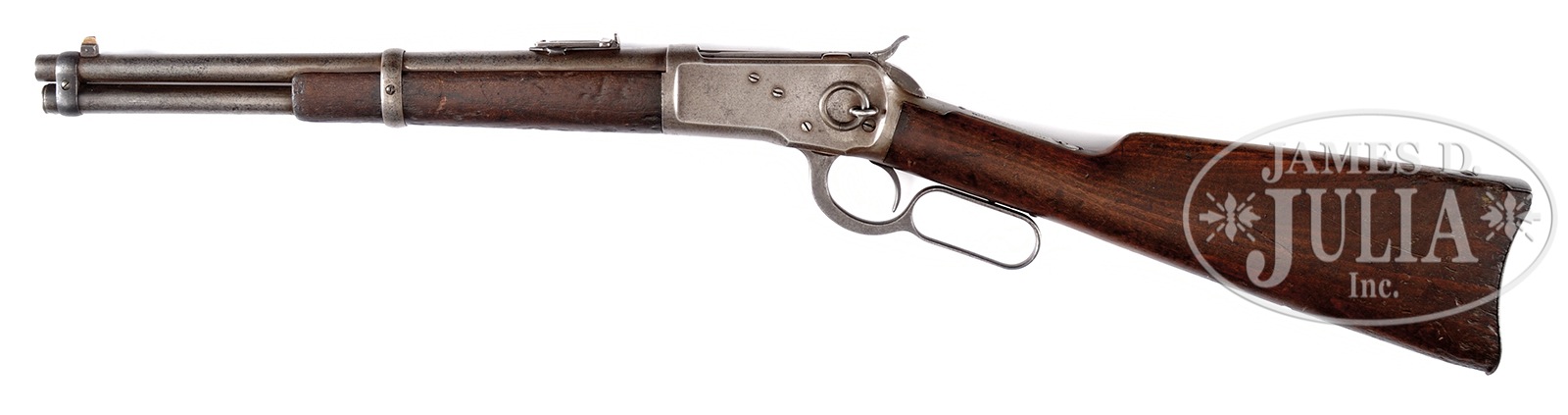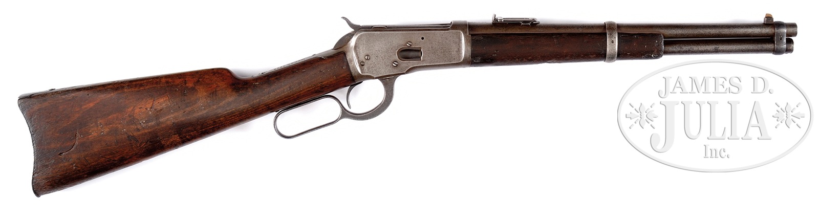 *WINCHESTER MODEL 1892 SADDLE RING CARBINE TRAPPER MODEL WITH 14″ BARREL.SN 691528. Cal. 44WCF. Bbl length 14″, blue finish, straight grain American walnut stocks. Saddle ring on left side of receiver. Standard carbine sights. Bbl and receiver bare “WP” proofs. Accompanying this carbine is a BATF Clearance Letter making this carbine exempt from the Gun Control Act of 1938. PROVENANCE: Collection of G.W. “Bill” Stewart of Sonora, Texas. CONDITION: Very good for this model. Carbine has an overall gray-brown patina with some roughness toward the muzzle end of the bbl. Receiver is a smooth gray patina with very little roughness. All markings are sharp and clear. Bore is dark with visible rifling. Stocks are good with numerous handling marks and dents, comensurated with the age of the carbine. Sling swivel holes have been drilled in the bottom of the butt-stock. No sling is present. 49973-29 TEP (3,200-5,200) C&R – Lot 2056 Click here to view provenance