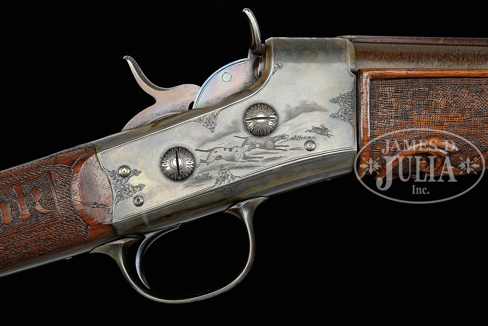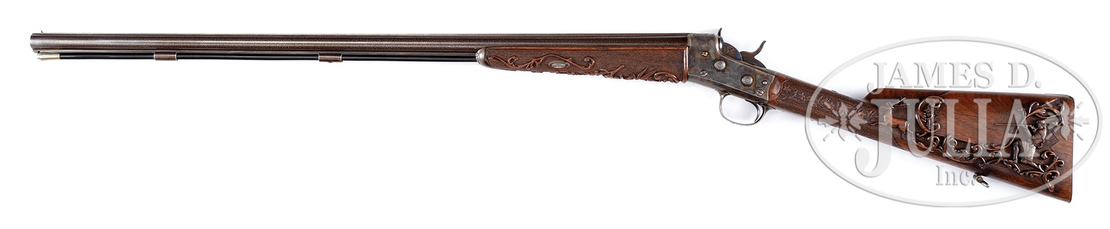 IMPORTANT FINELY ENGRAVED REMINGTON NUMBER “2” ROLLING BLOCK SHOTGUN WITH RELIEF CARVED STOCK, OWNED BY SAMUEL REMINGTON, SON OF ELIPHALET REMINGTON.SN NSN. Cal. 16 ga. 2-1/2″ Chamber. 32″ Bernard Damascus steel bbl is gold inlaid “E Remington & Sons Ilion New-York, U.S.A.” on full length flat rib. Bottom bbl is affixed with another rib in the manner of guns and rifles of the percussion era, mounted with two plain pipes holding ebony ramrod with bulbous German silver head and tail with removable cap. Rear portion of bbl is stamped with Belgian proofs. Slim, case hardened, no. 2 rolling block action with distinctive shaped back, and absence of pin retaining saddle, is marked “REMINGTON’S ILION. N.Y. U.S.A.” and with 1864 and 1866 patent dates on top tang. A crowned “V” proof is behind hammer. Action is finely engraved with sprays of scroll surrounding nicely detailed hunting scenes on each side. A pair of pointers pointing and honoring a pheasant flushing over rail fence, is on left side; and it appears that the same dogs are chasing after a rabbit, on right. Top of action is emblazoned with heraldic American eagle with a shield and “E Pluribus Unum” banner. A small circular stamp around a “G” bridges the joint between bbl and nicely filed transition to action. Trigger guard portrays fine rendition of side-on stag browsing on tree branch. Plain American walnut straight grip buttstock is fitted with trap steel buttplate with medium top spur. Some cleaning equipment is in recesses under cover. There is some mother-of-pearl inlay on rear of comb line. Left side of buttstock is fully relief carved. It is obvious that the carver was familiar with similar ornamentation found on elaborate German Schuetzen Target Rifles, this carving, however, distinctively American and in a most wonderful folksy manner; It depicts a Frontiersman in buckskins shooting a running stag. This carving flanks small cheekpiece, which is further embellished with full relief scrolling tendrils with punch-stippled background. In place of checkering there is some more stippled decoration surrounding foliate scroll on left, and a rectangular area on right of stippling outlining “Mohawk” in old English script. The Mohawk river valley was the site of the Remington Mansion and its possible it may have been referred to as “Mohawk”. It is known that Remington built an extraordinary mansion in this region purposefully to impress Russian royalty who were customers. Of course the Remington factory was also located in this region. Right rear of butt is decorated with the stippled monogram “SR” for Samuel Remington who was son of Eliphalet. Matching forend with engraved steel thimble, attaches to bbl with side nail through oval steel escutcheons, and is embellished with more relief carved scroll and trailing flowers, which have mother-of-pearl centers. Bore diameter: .670. Bore restrictions: .000 (cylinder), Drop at heel: 2-7/8″, drop at comb: 2-11/16″. Weight: 6 lbs. 3 oz. Samuel Remington was E.R. & S’s highly successful and influential foreign sales agent. It is most probable that this highly ornamented sporting gun was created by the Nagant brothers, Remington licensee in Liege Belgium, as a token of their esteem. PROVENANCE: Paul Tudor Jones II Collection. CONDITION: Exceptionally fine. Bbl retains nearly all of its dramatic brown finish with excellent definition to pattern. Action has only high edge wear to its lovely orig case hardening color, tangs slightly faded and silvered. Stocks retain nearly all of their orig finish with some light marks and scratches, and a couple of fairly deep scratches on cheekpiece. Carving has a fine hand worn brightness. Bore is excellent. Action is crisp. 49941-43 MGM178 (10,000-20,000) – Lot 2057